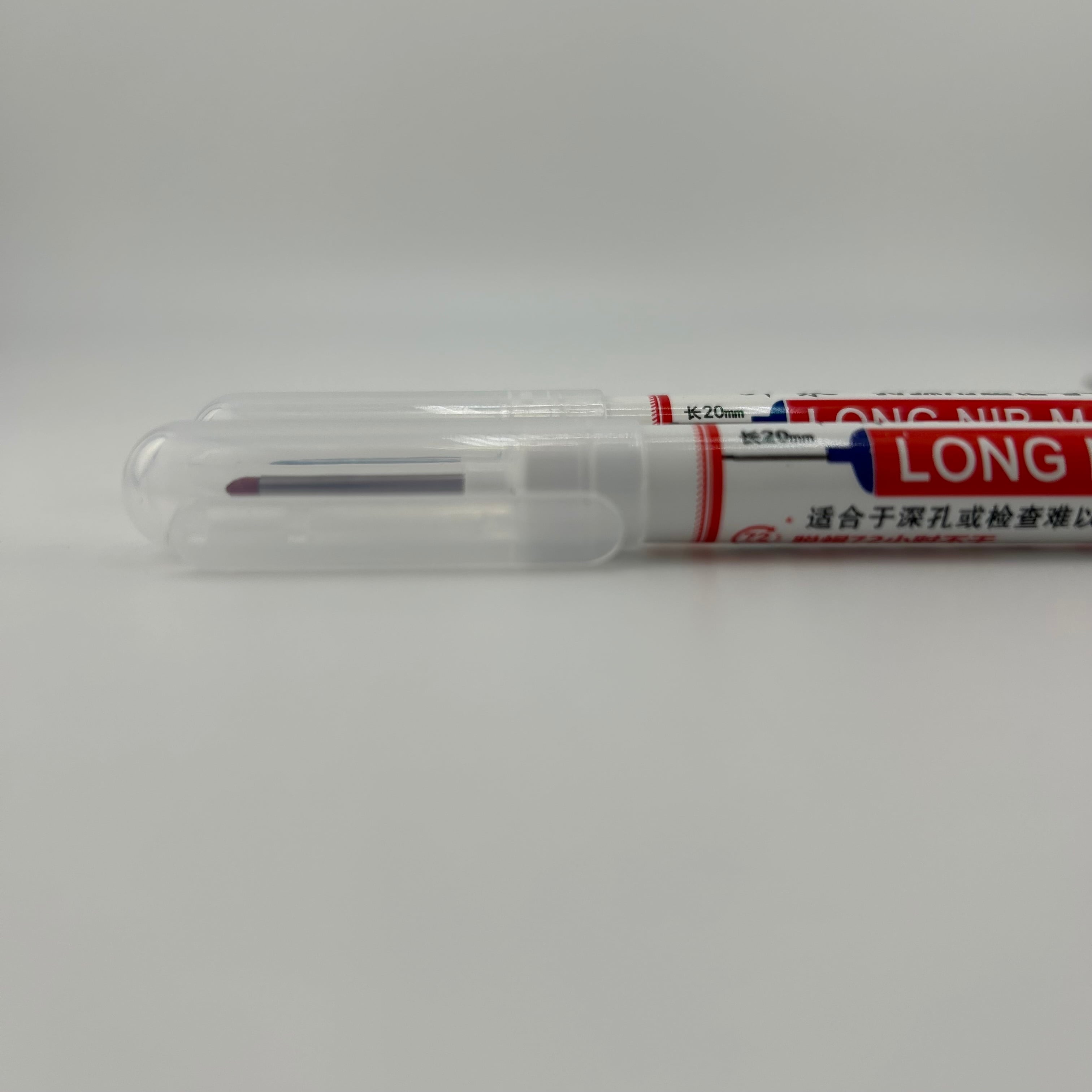 先端が約20mmと細長く、ペン先が見やすく、手元を避けて書けるのが特徴のマーカーです。