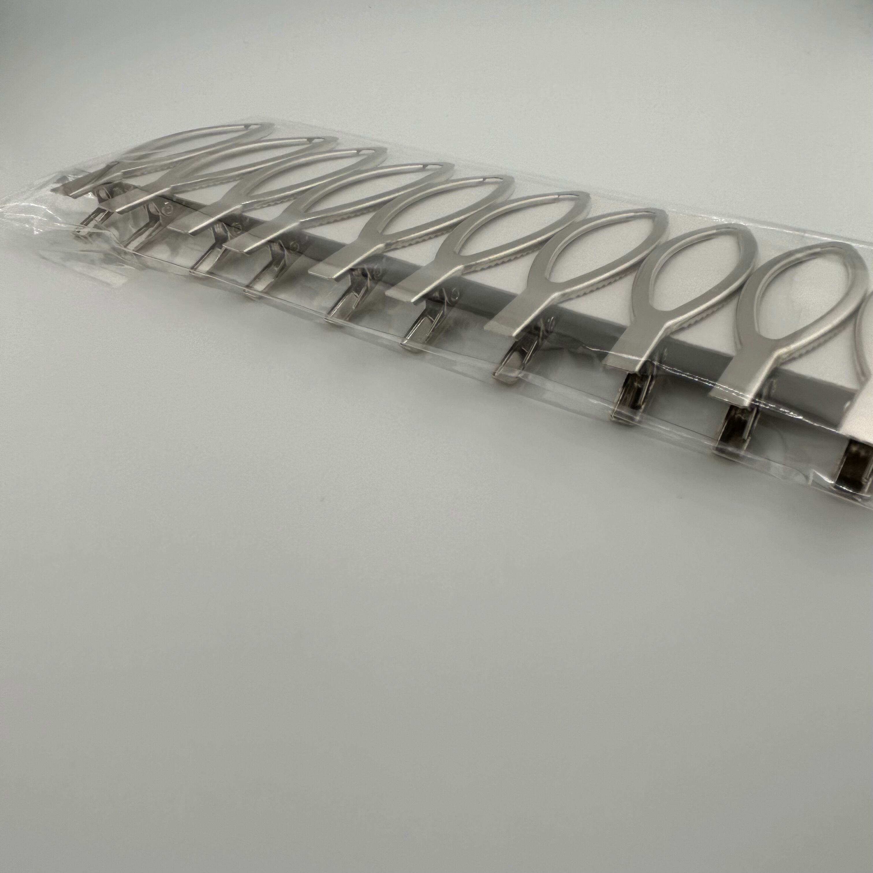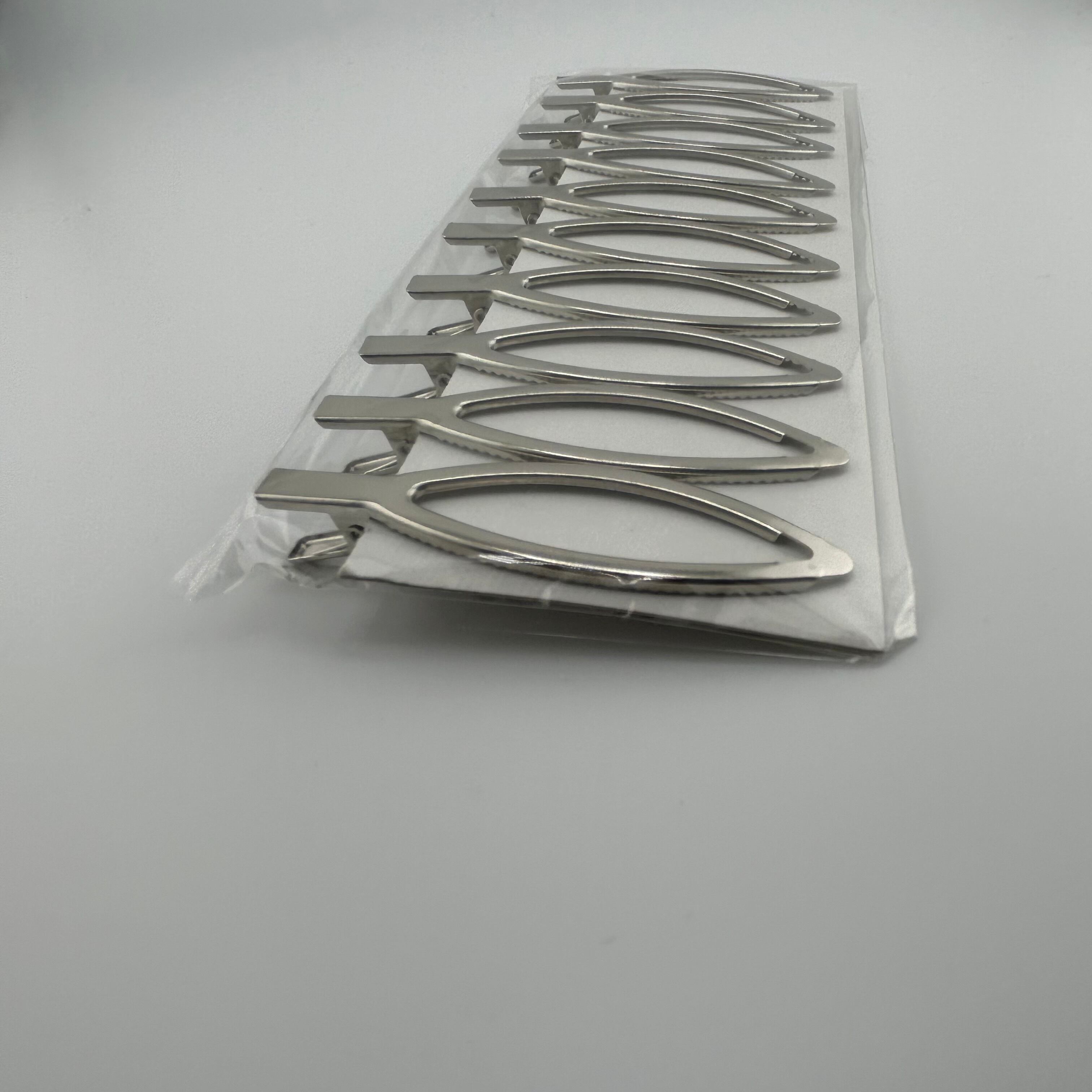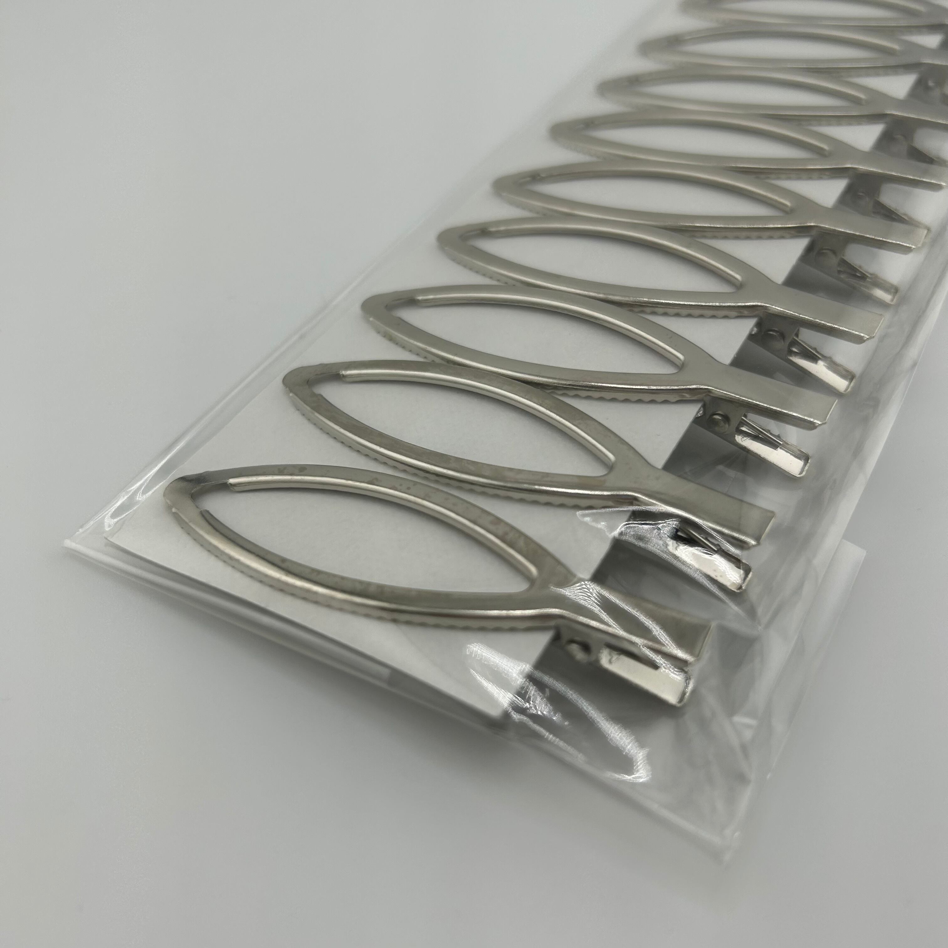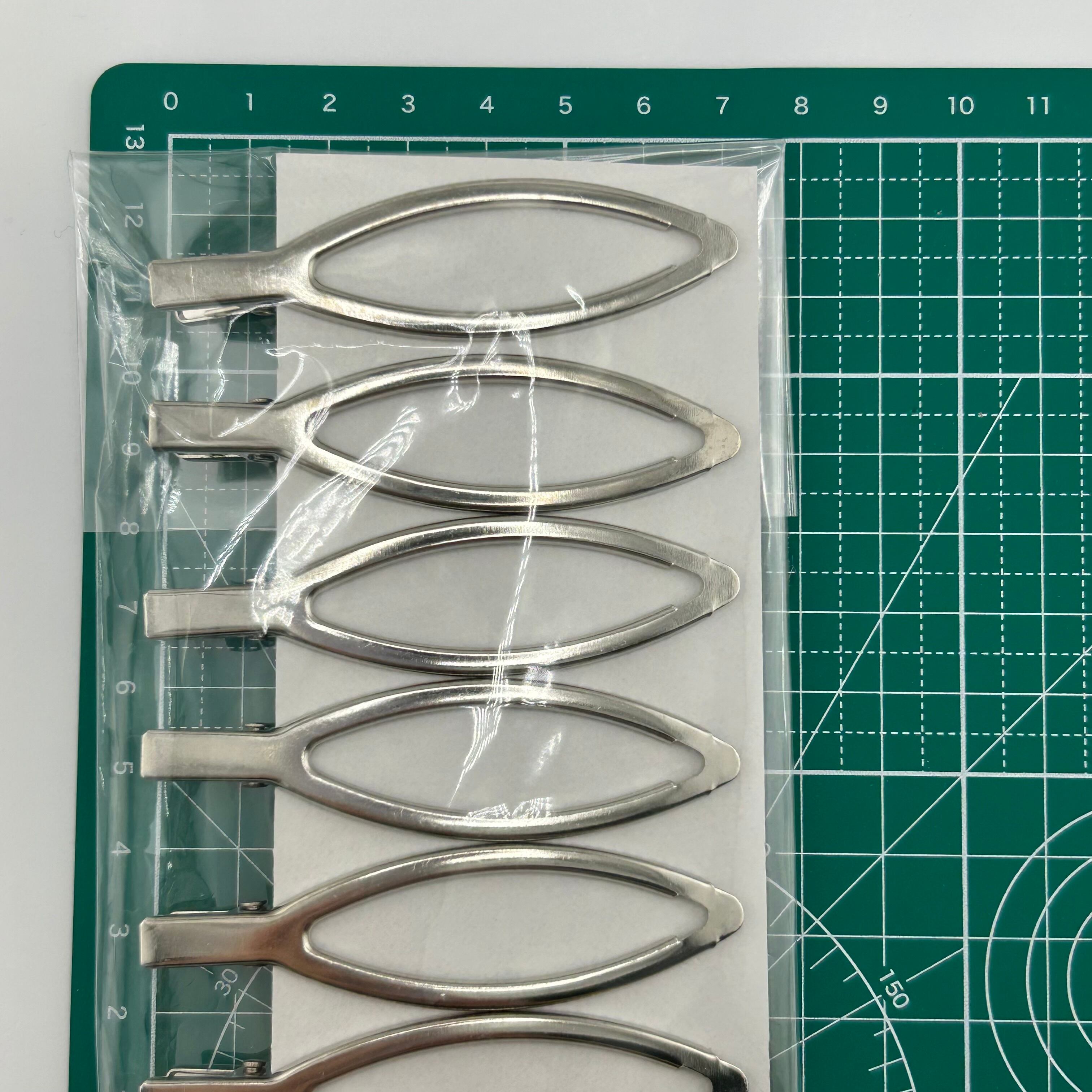 細長い楕円形のフレームが特徴的な、シルバーカラーのクリップパーツです。