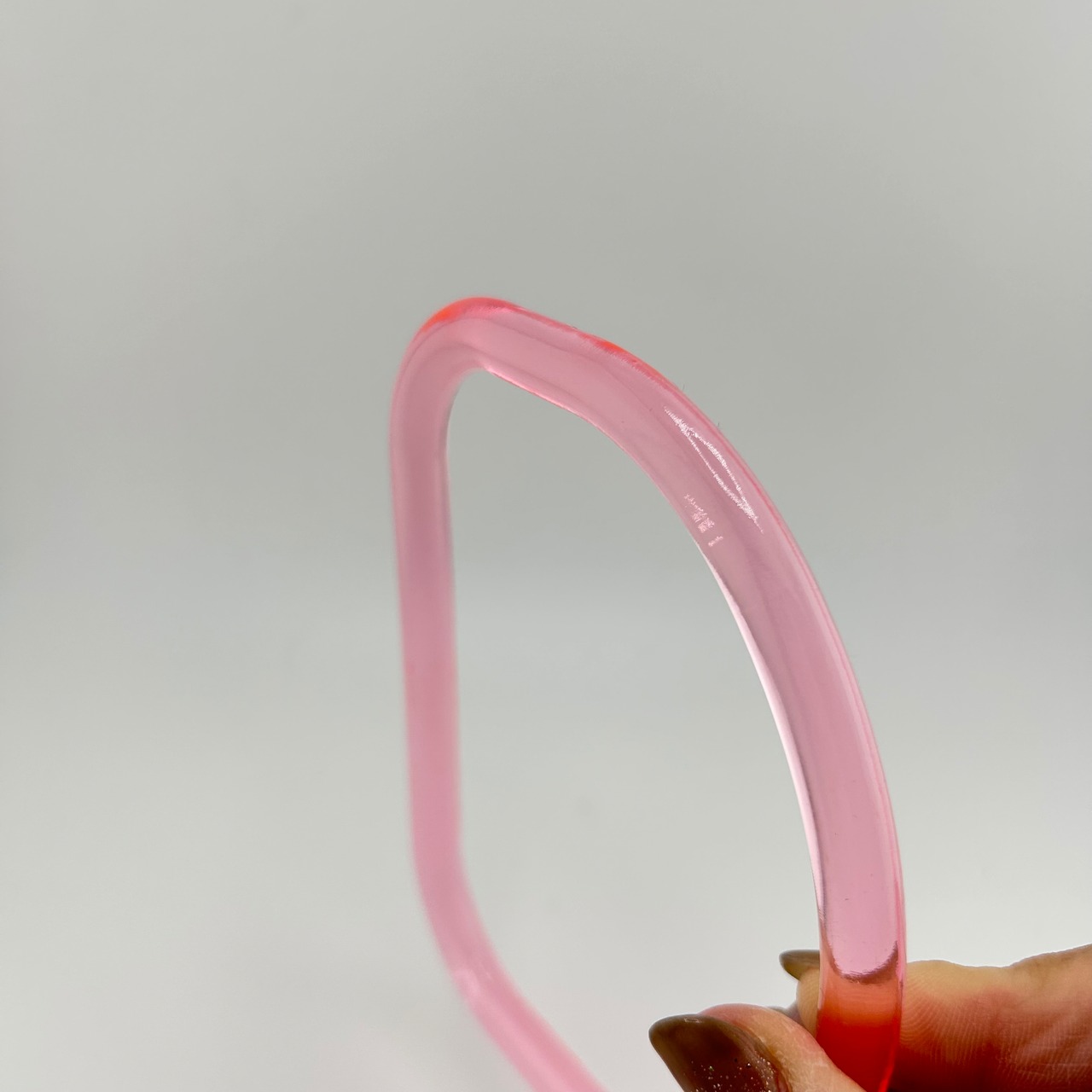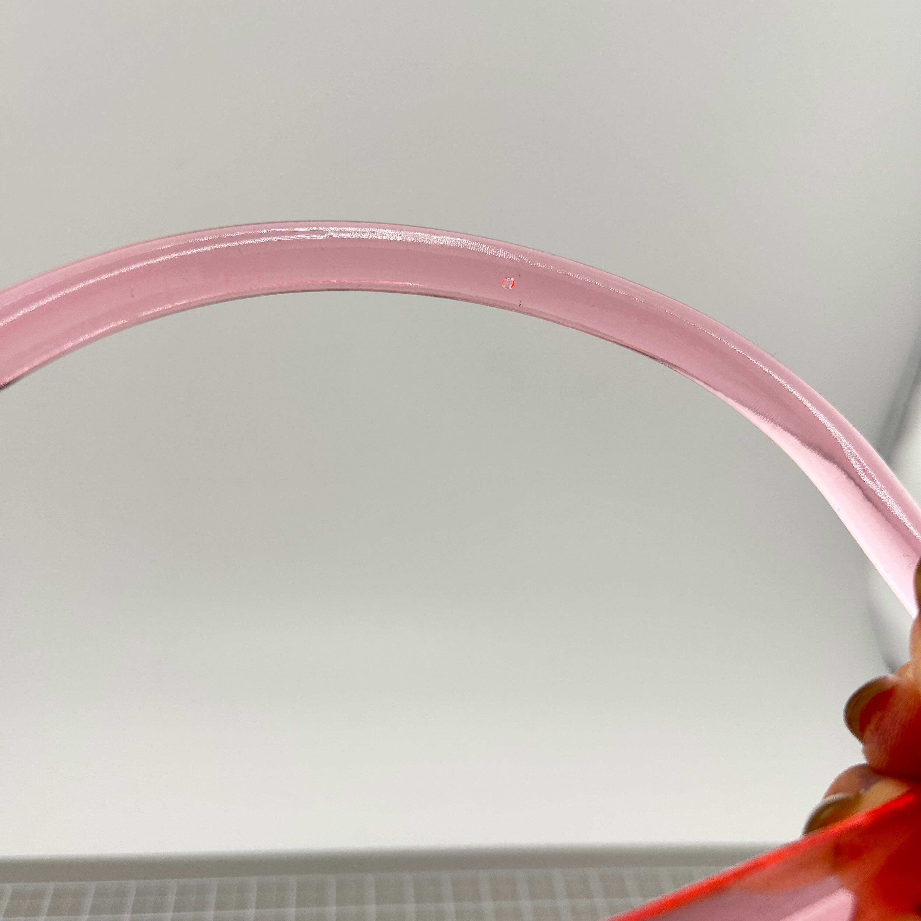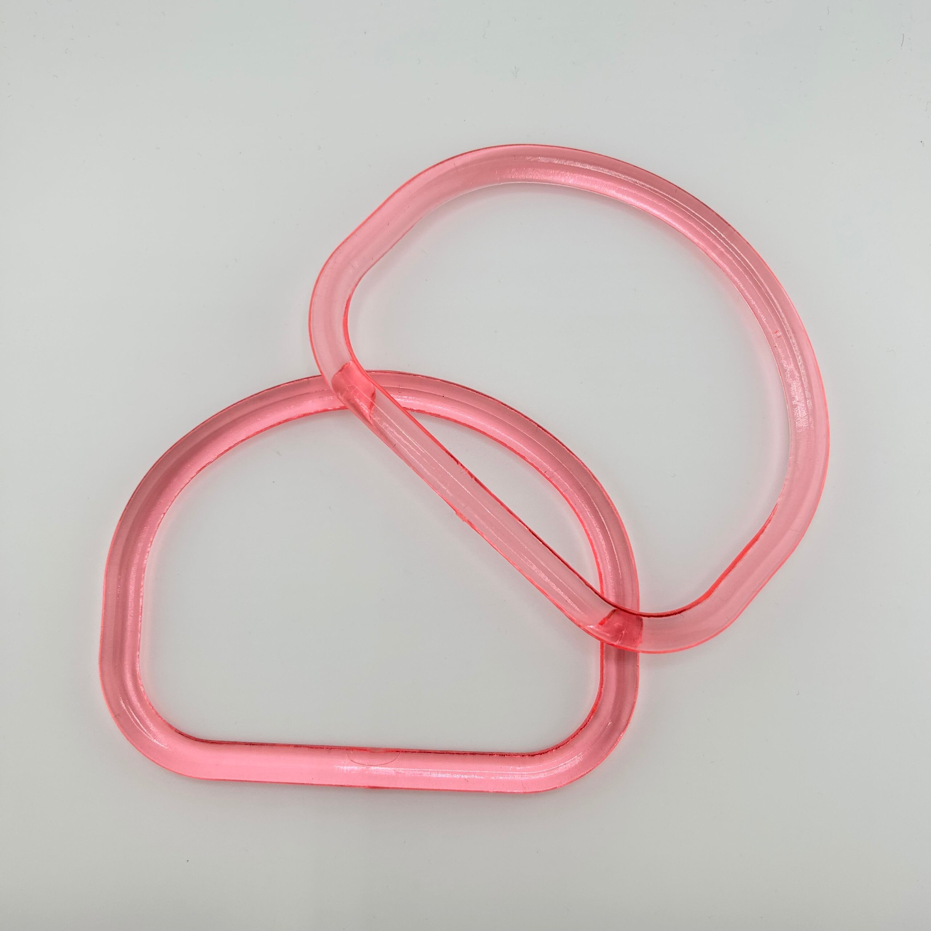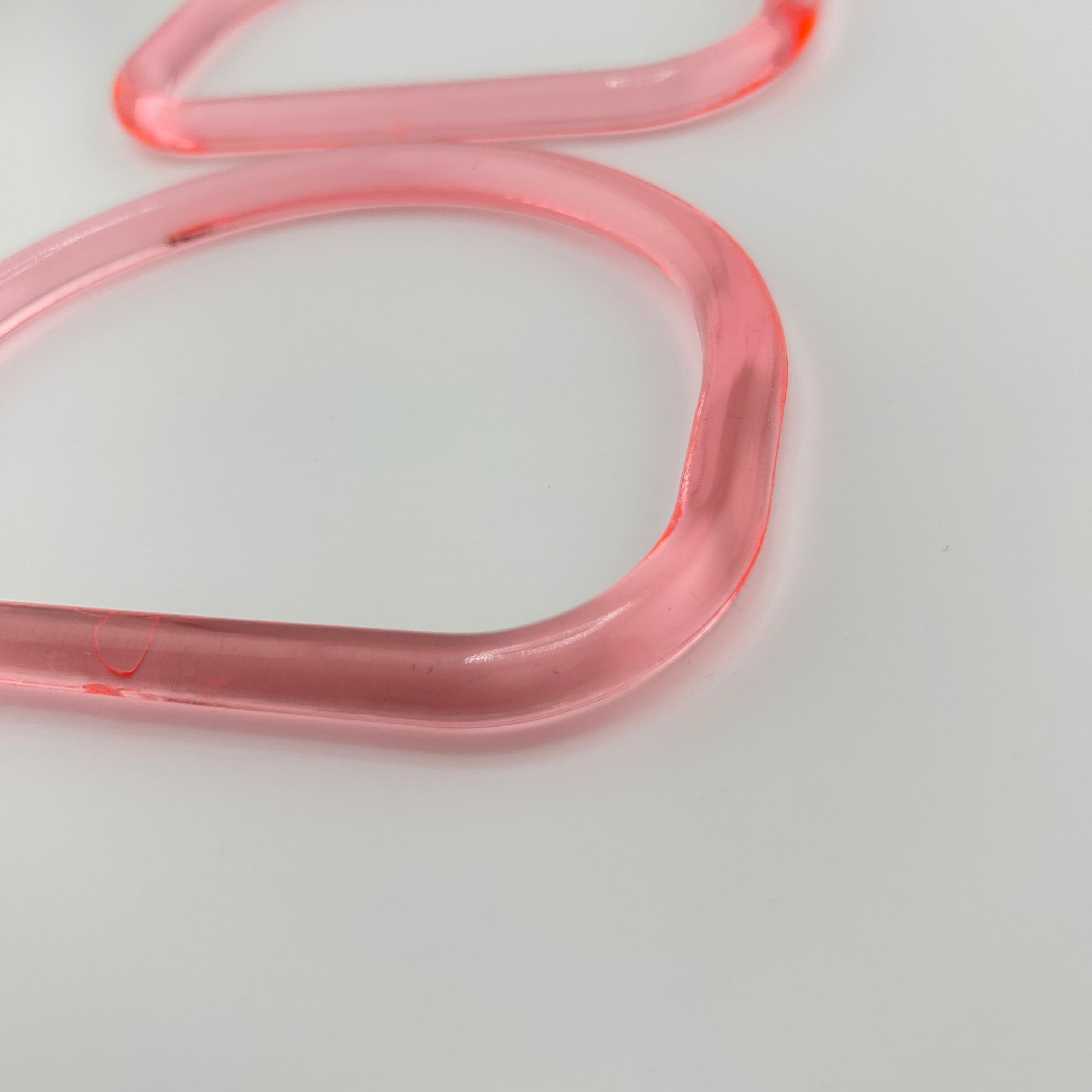 透明感のあるピンクが目を引く、アクリル製のバッグ用持ち手です。