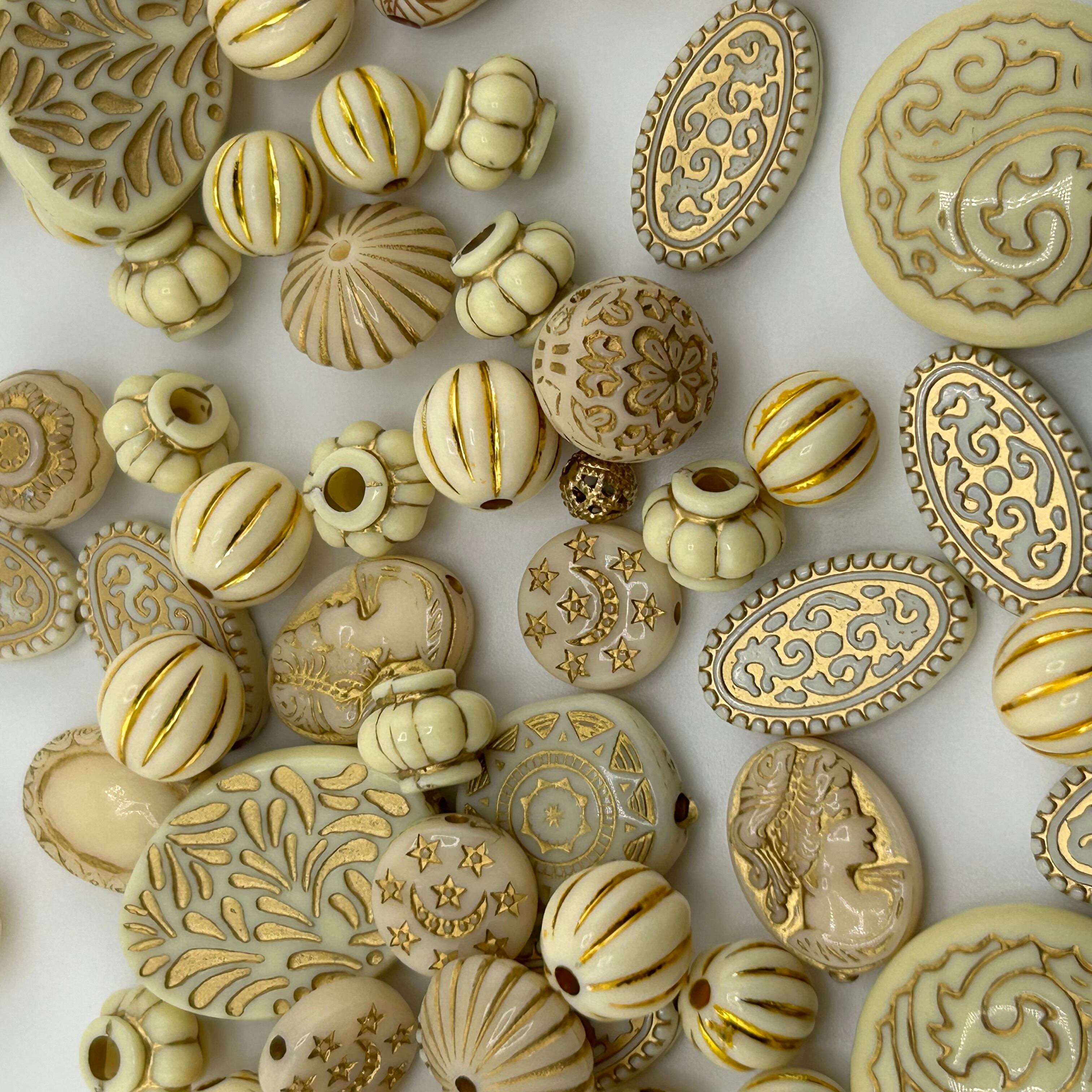 クリームカラーにゴールドのラインや模様が映える、上品で大人っぽい雰囲気のビーズです。