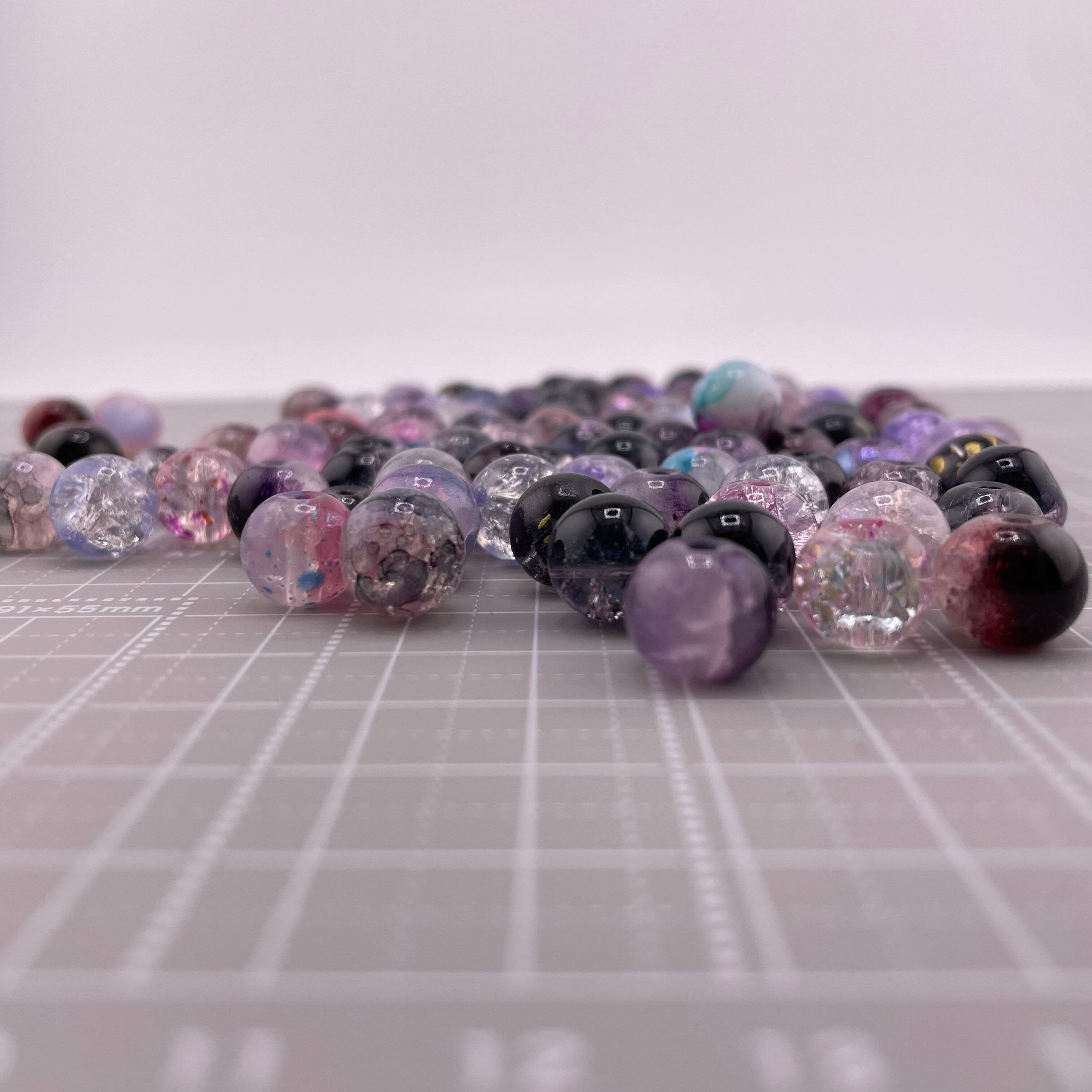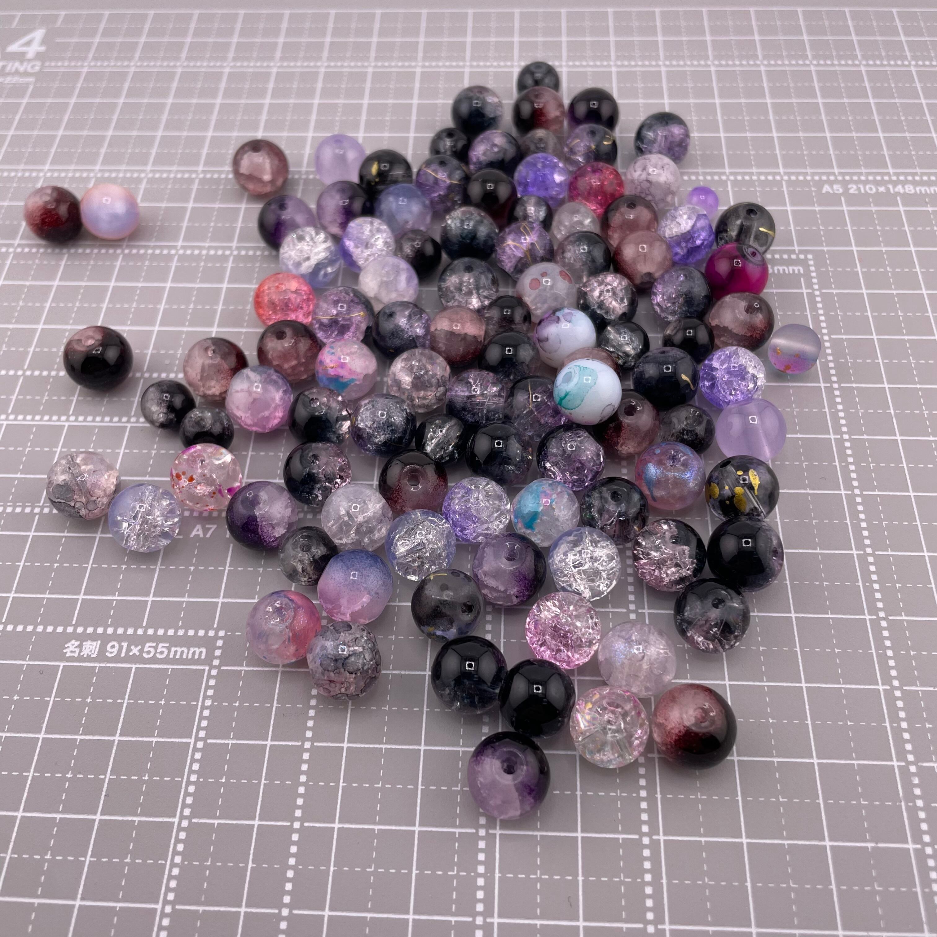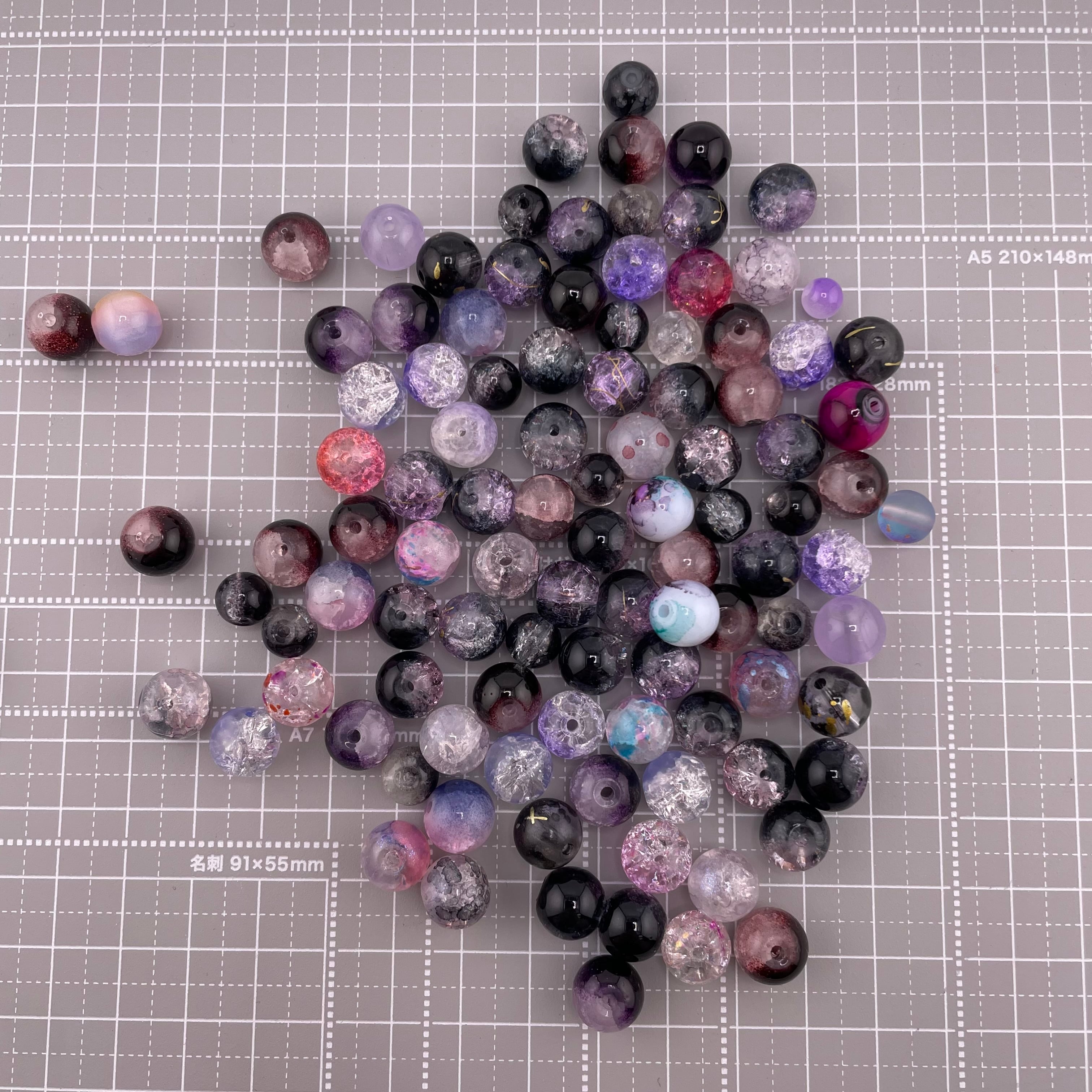 ブラックパープル系を中心に、透明感のあるクラックビーズやマーブル調、ラウンド型など様々なデザインが入っています。ランダムミックスなので、ハンドメイド作品に個性と華やかさをプラスできます。