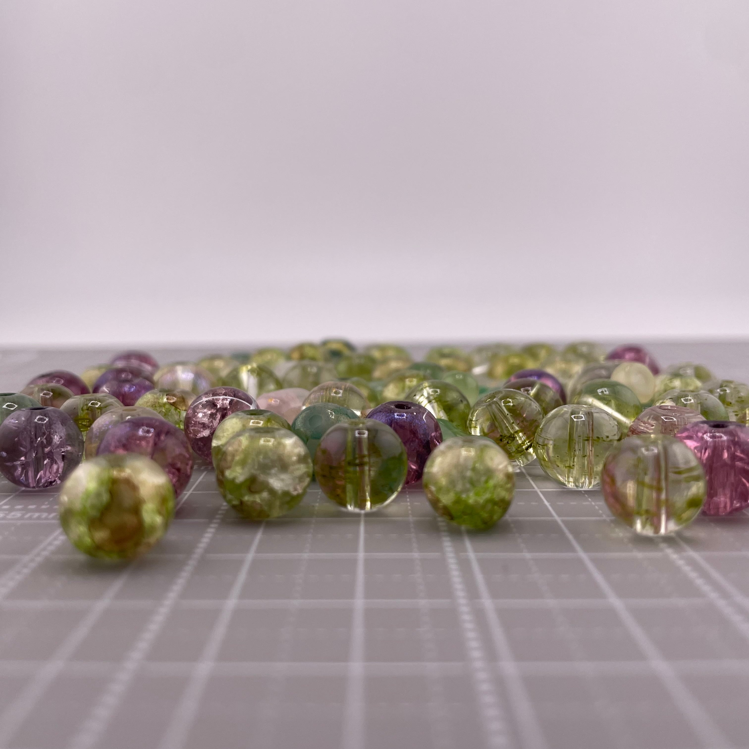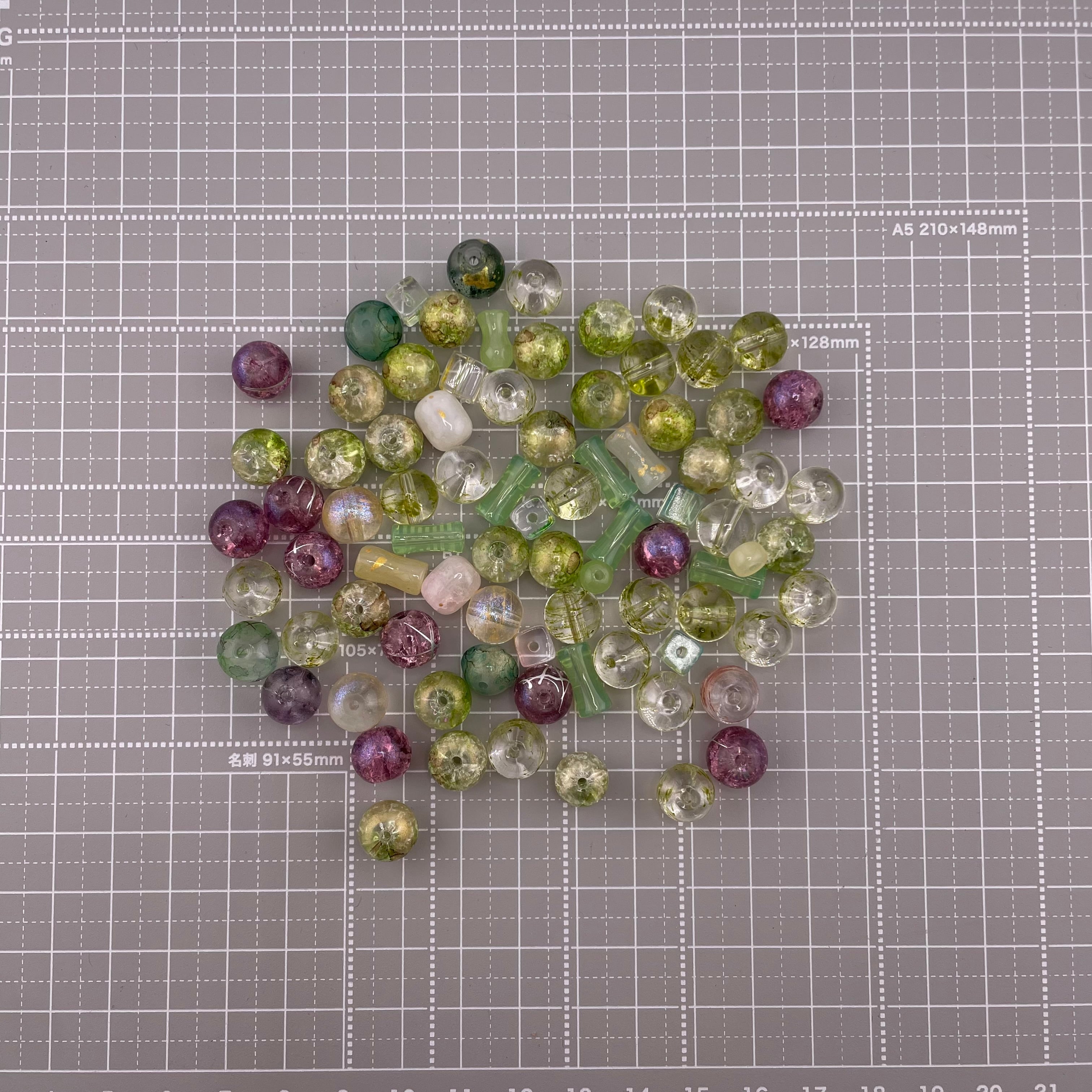 グリーン系を中心に、透明感のあるクラックビーズやマーブル調など様々なデザインが入っています。ランダムミックスなので、ハンドメイド作品に個性と華やかさをプラスできます。