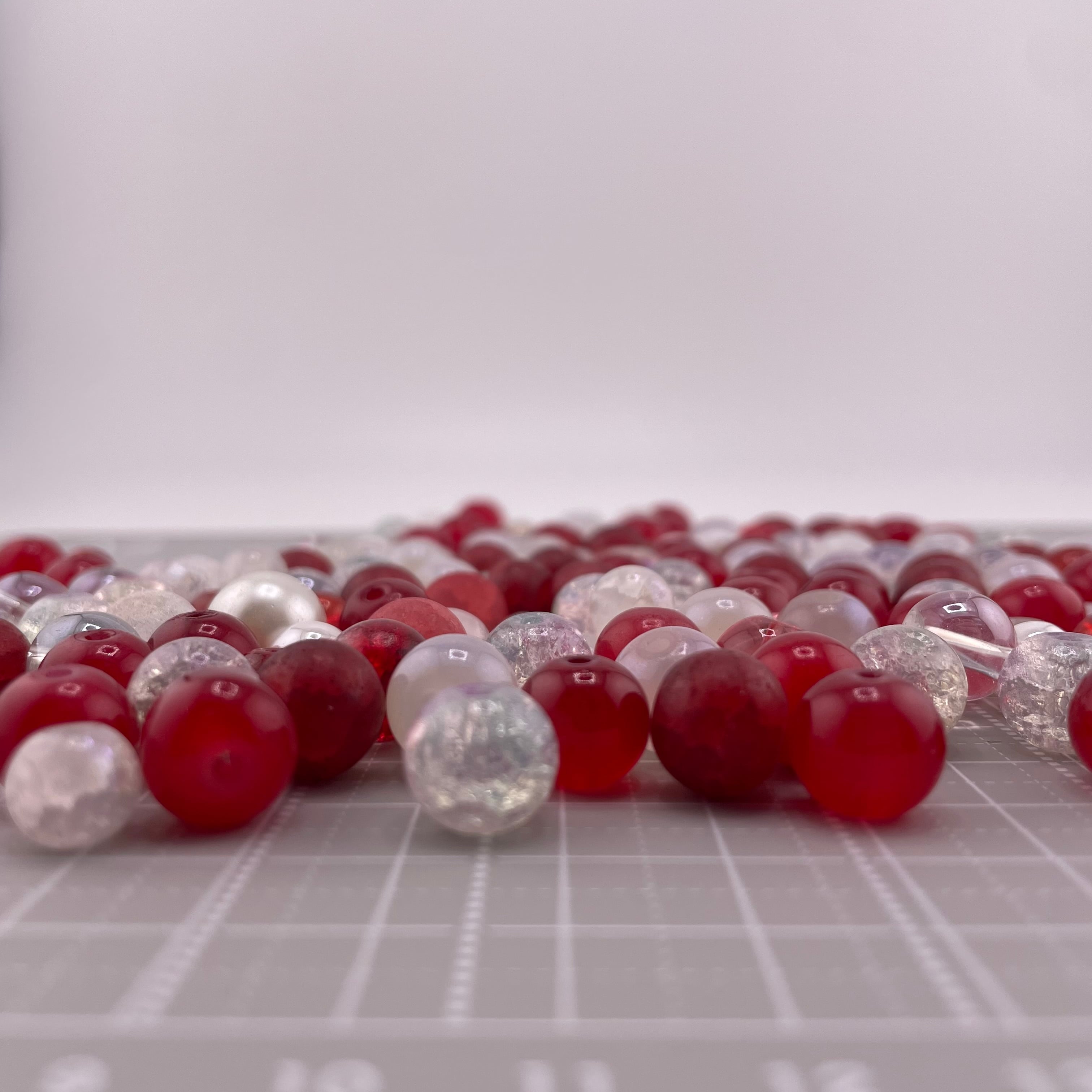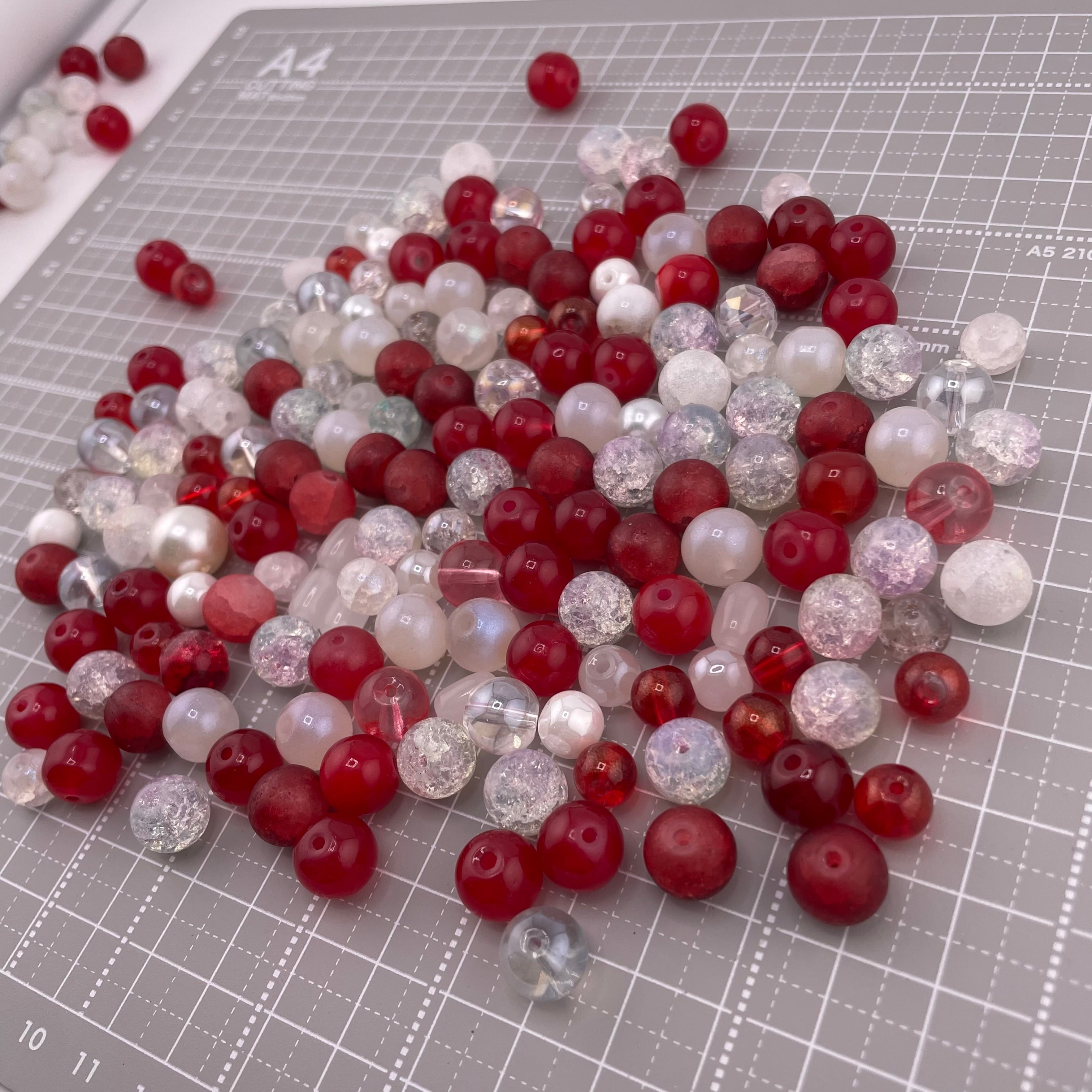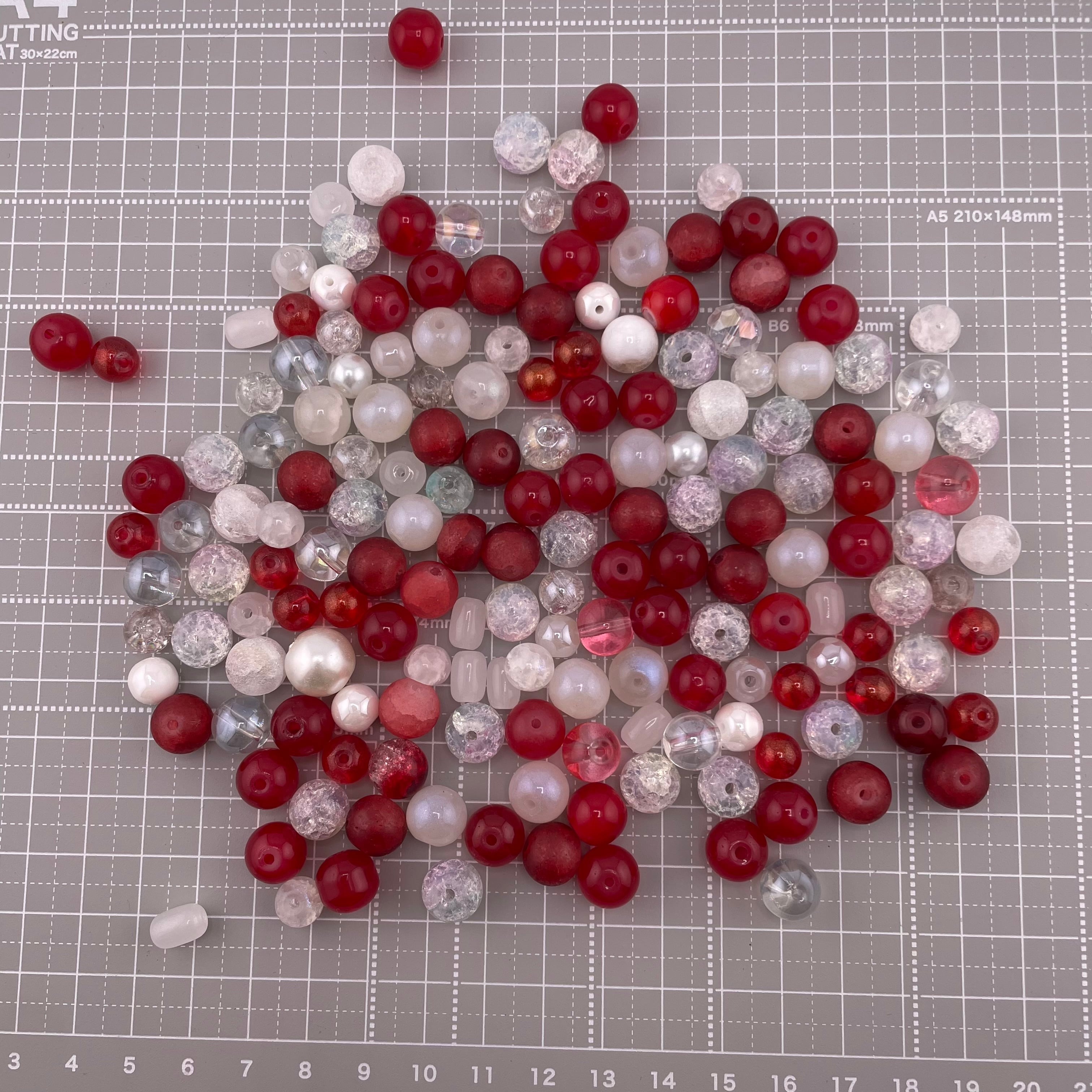 レッド・ホワイト系を中心に、透明感のあるクラックビーズなど様々なデザインが入っています。ランダムミックスなので、ハンドメイド作品に個性と華やかさをプラスできます。