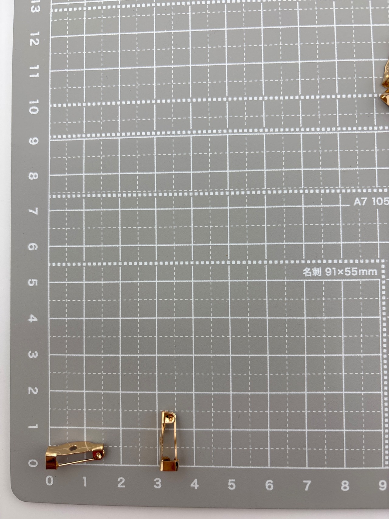 ハンドメイド作品に便利で、裏面にパーツを接着してオリジナルのブローチやコサージュ作りに最適。安全ピンタイプなので取り付けも簡単です。