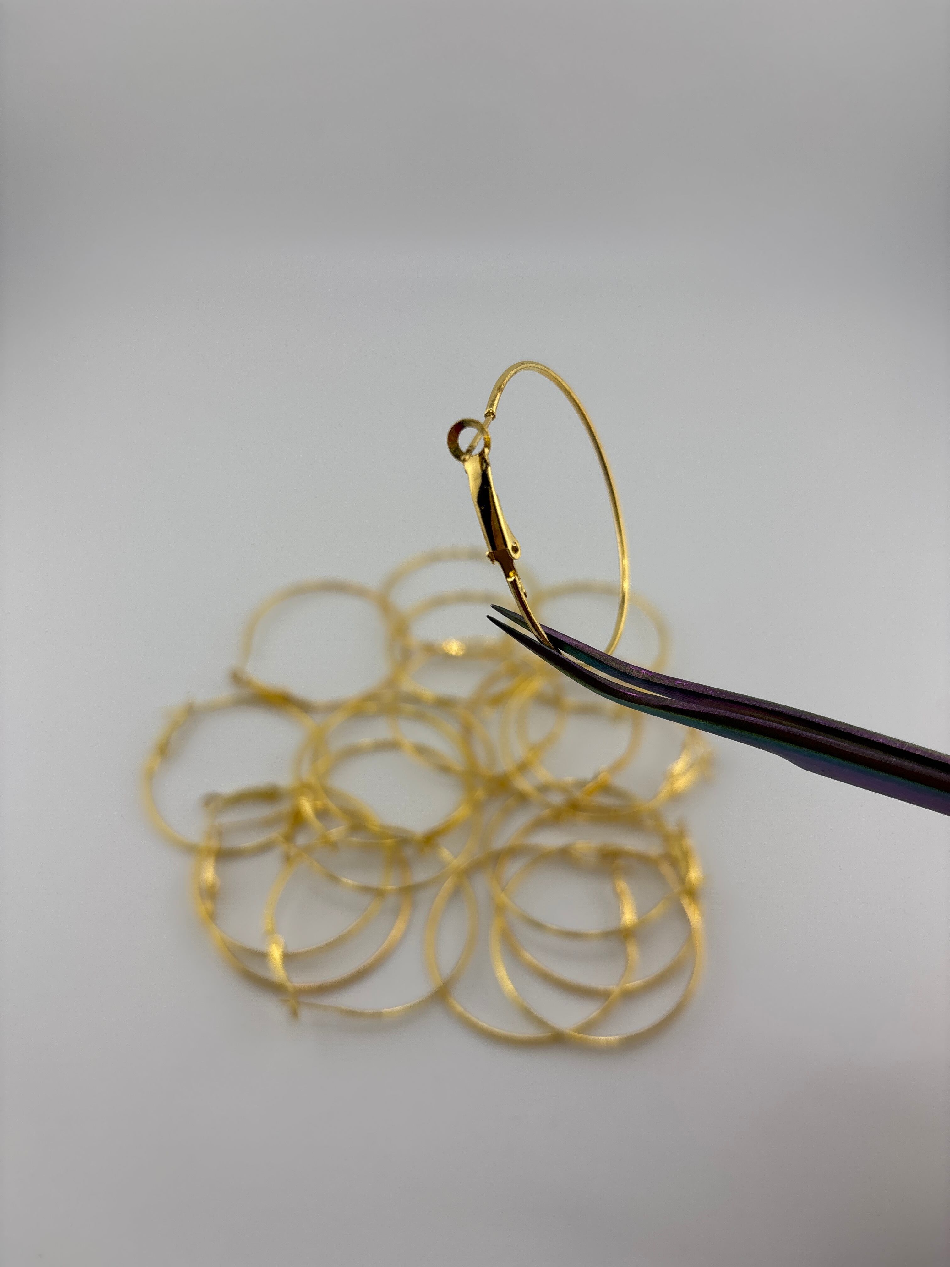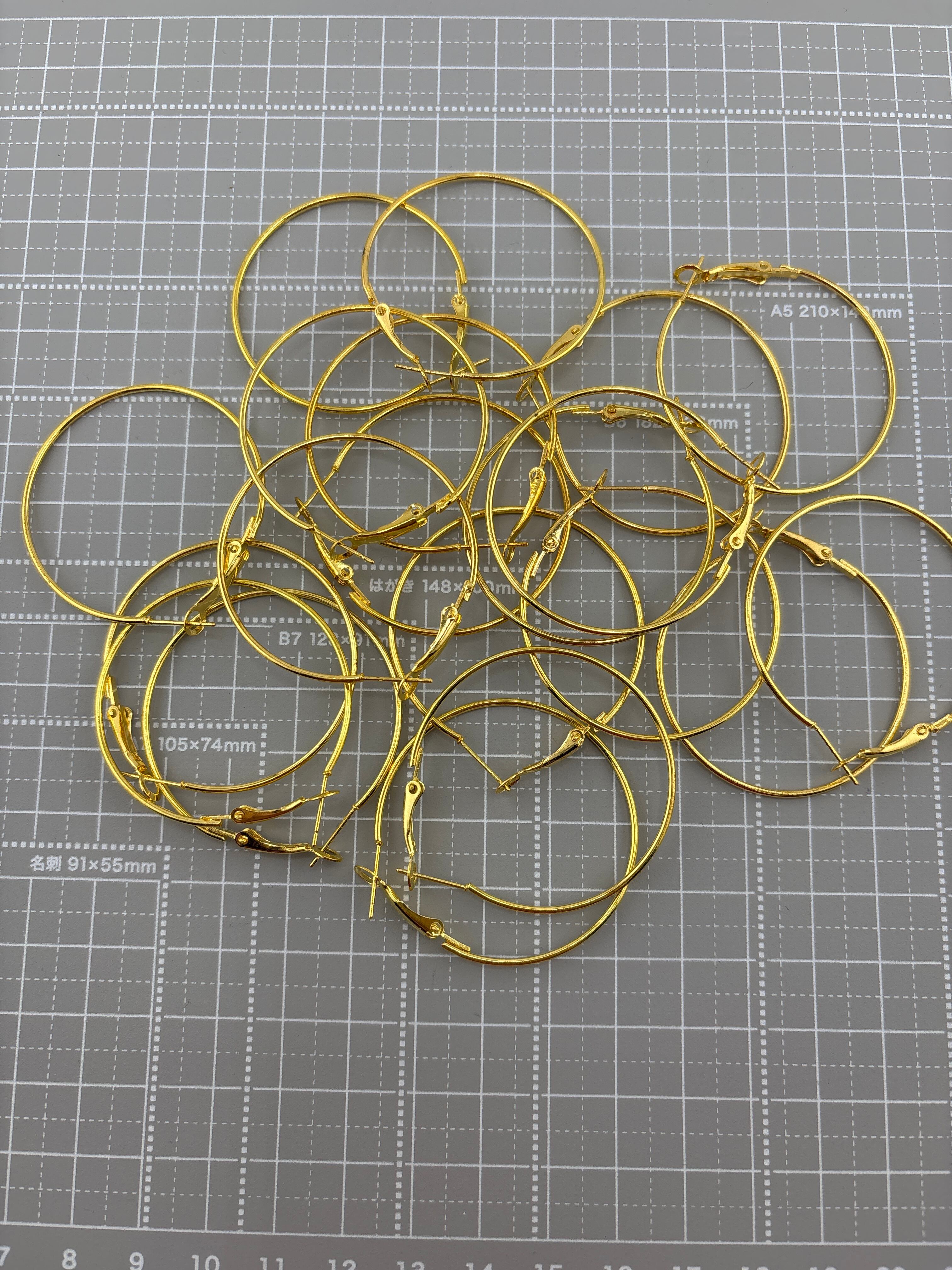 リユースパーツのフープピアス金具です。中サイズで扱いやすく、ビーズやチャームを通してオリジナルピアスを制作できるほか、そのままでもシンプルなフープピアスとしてお使いいただけます。