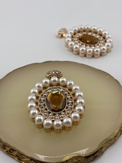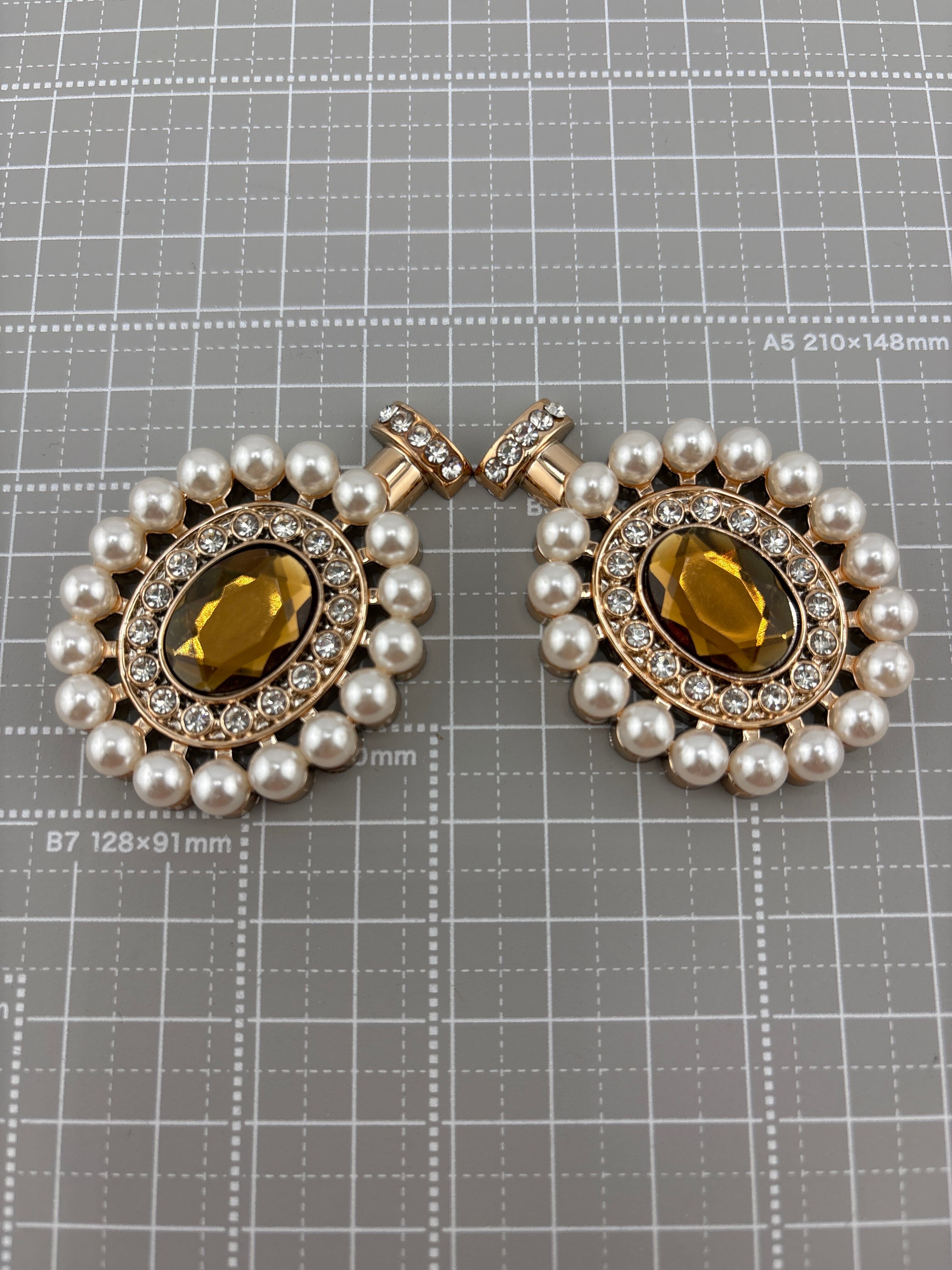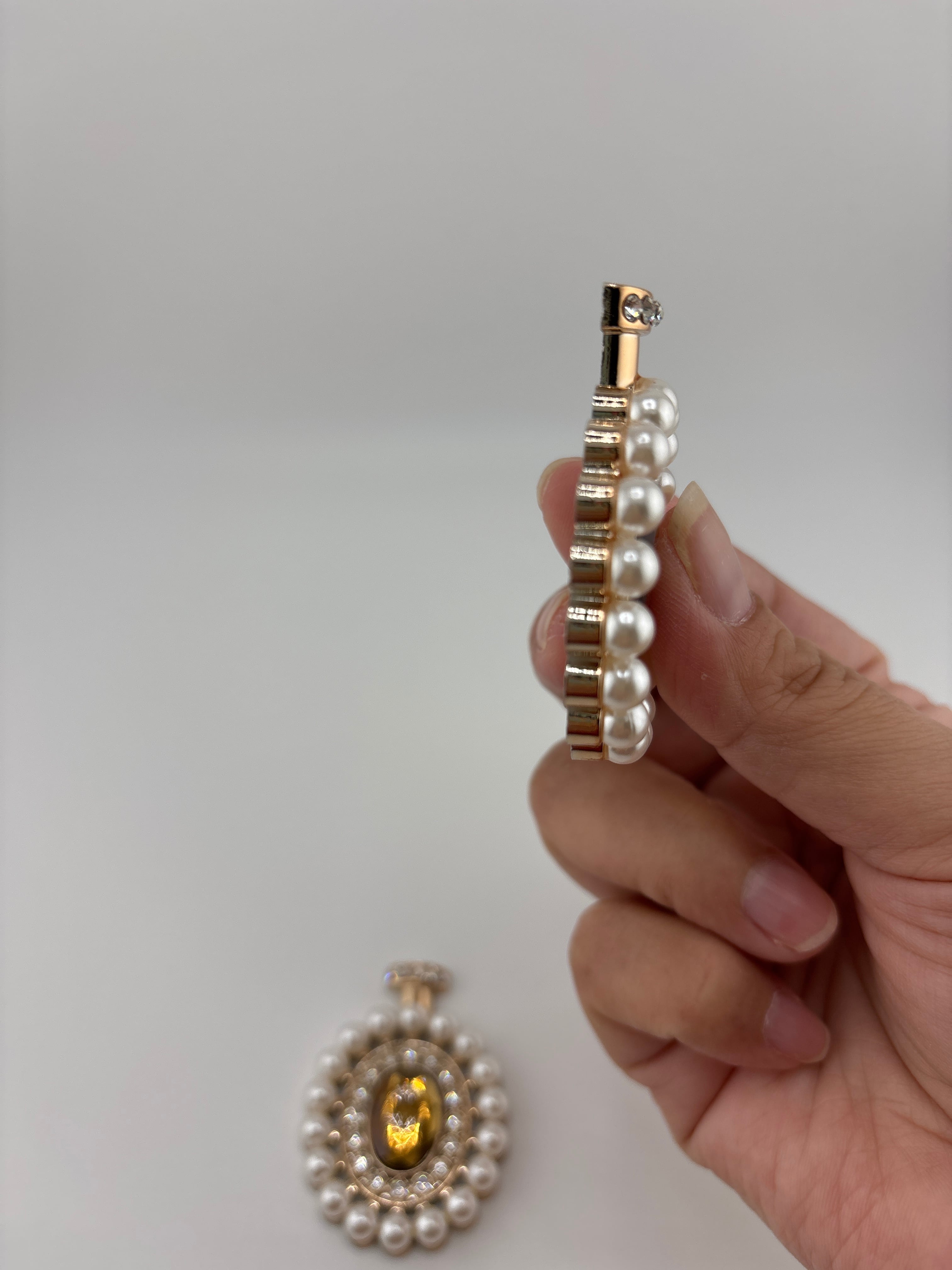 中央のストーン風パーツと周囲のパール・ラインストーン装飾が、ラグジュアリーで存在感のある仕上がり。