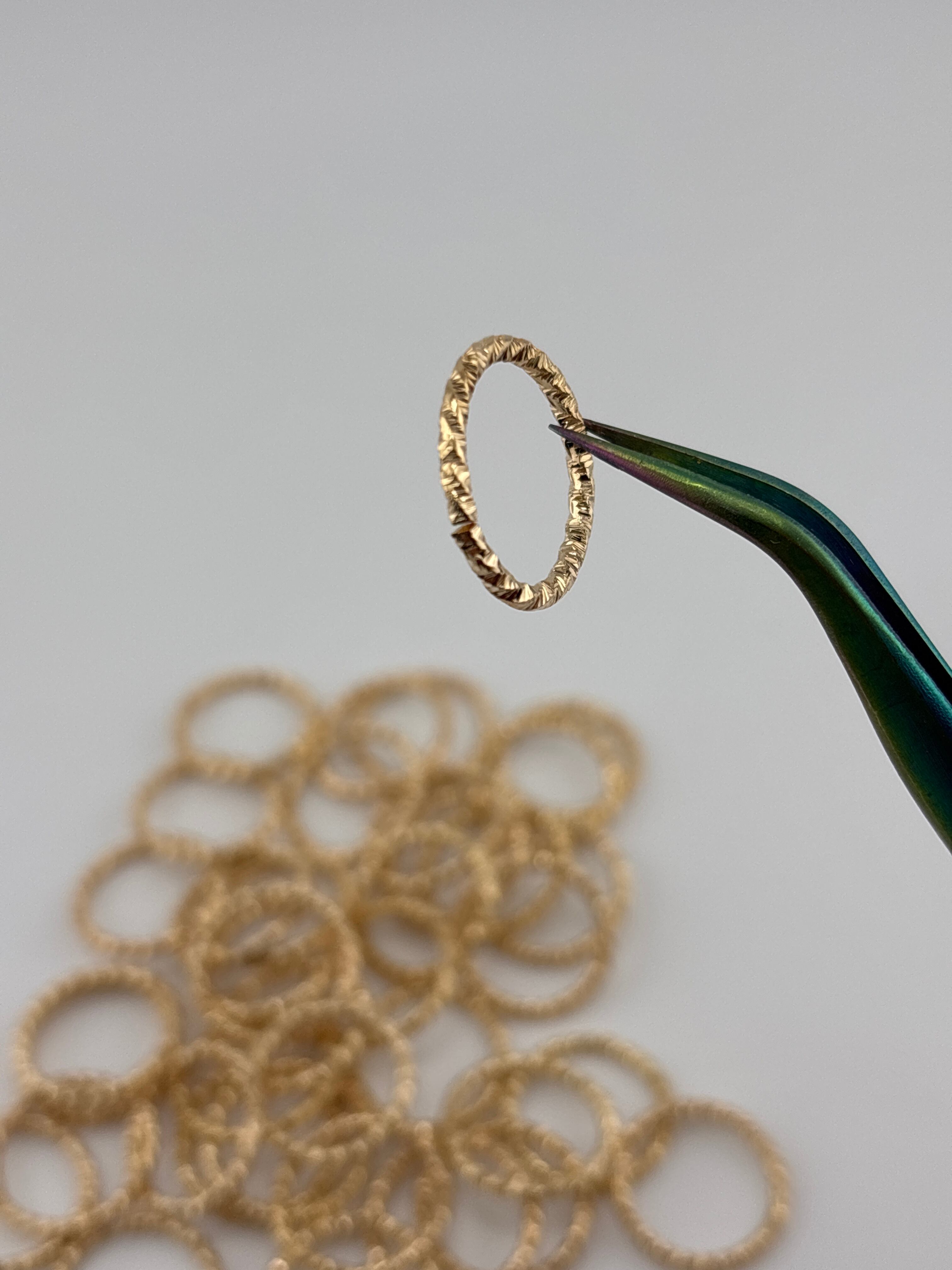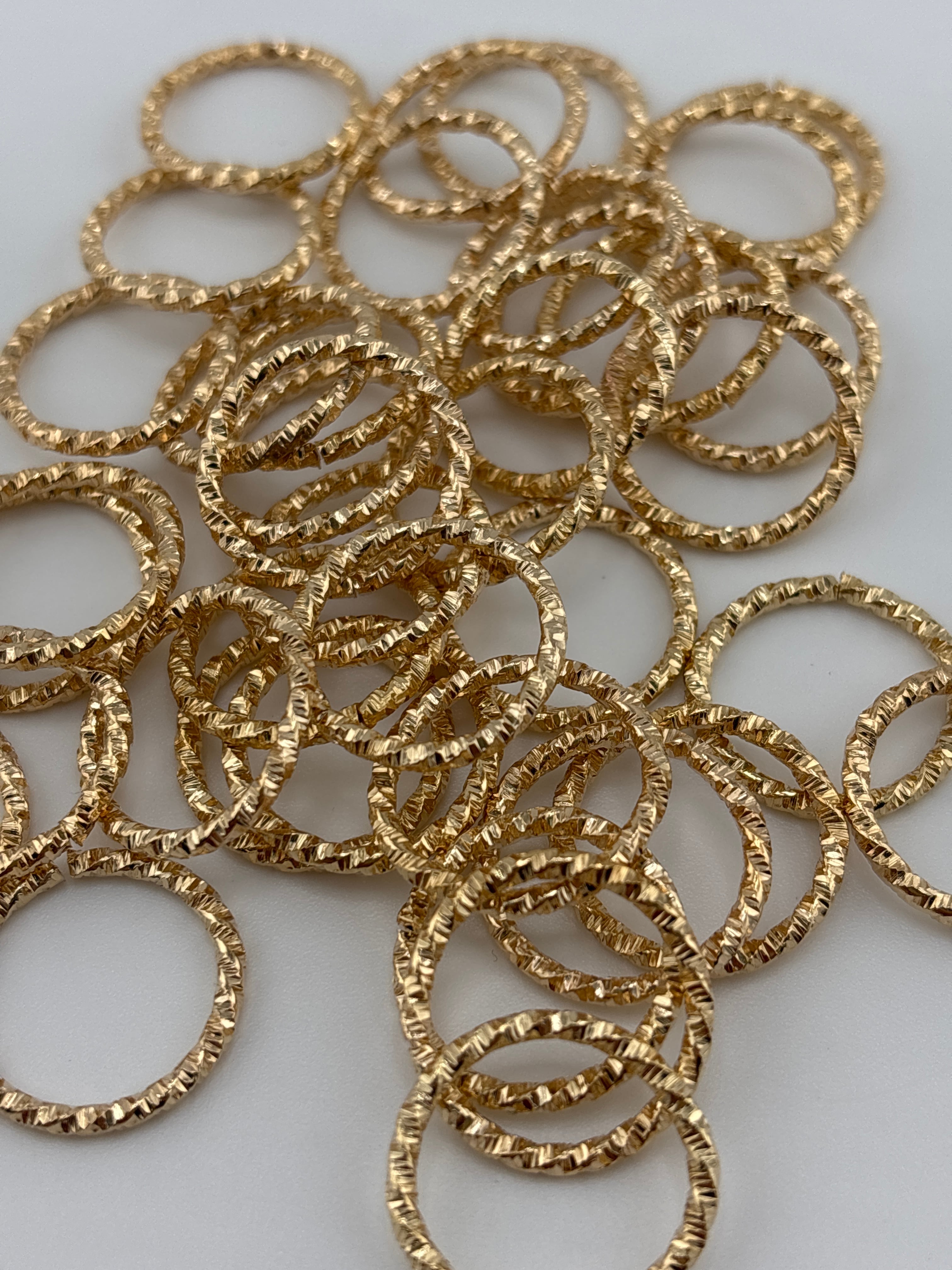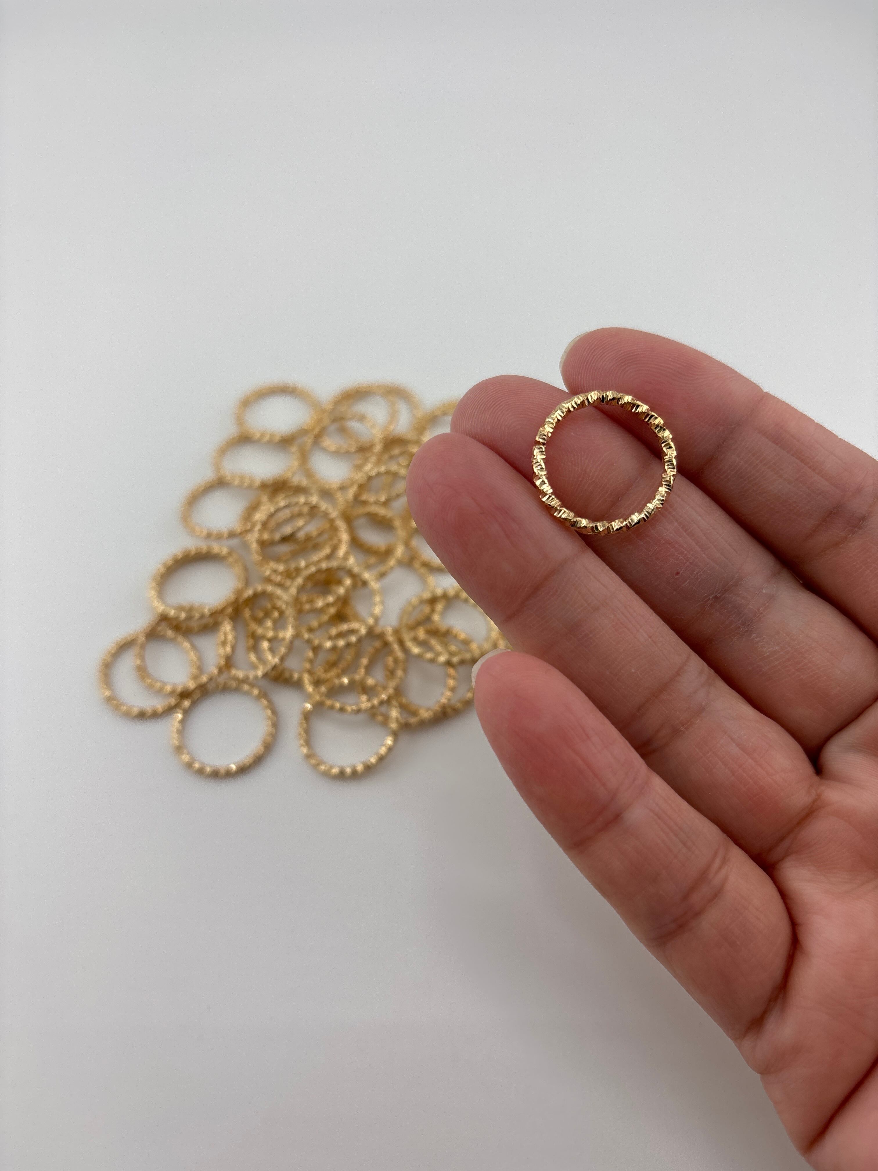表面にデザイン加工が施された18mmの丸カンです。通常の丸カンよりも存在感があり、アクセサリーのアクセントにぴったり。イヤリングやピアス、ネックレス、チャーム制作など幅広く活用できます。