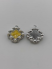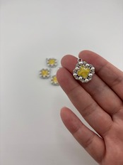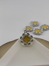 中央のイエローの四つ葉風デザインを、パールとラインストーンで囲んだ高級感のある仕上がり。小物やアクセサリーのワンポイントとして映える存在感があります。