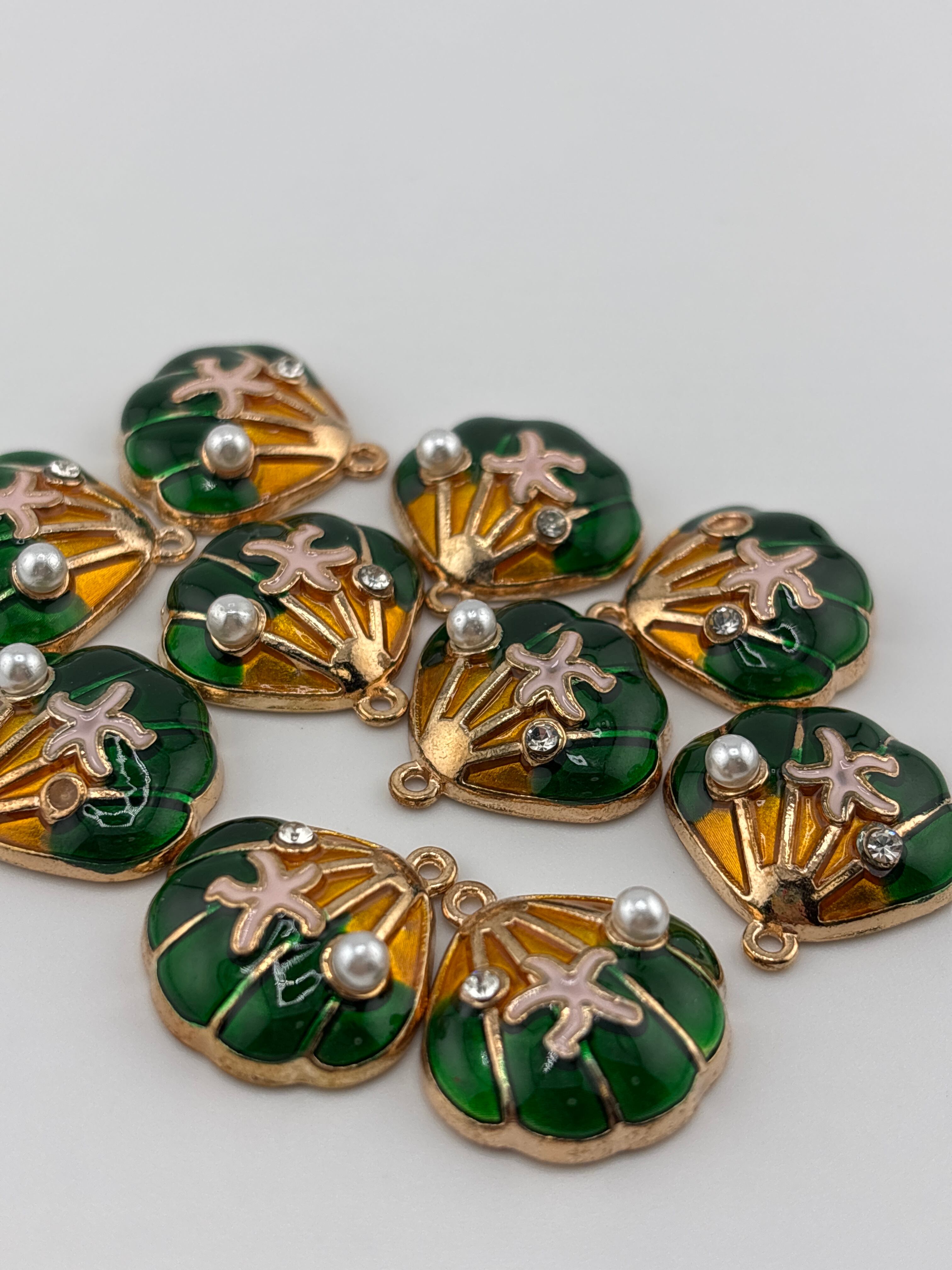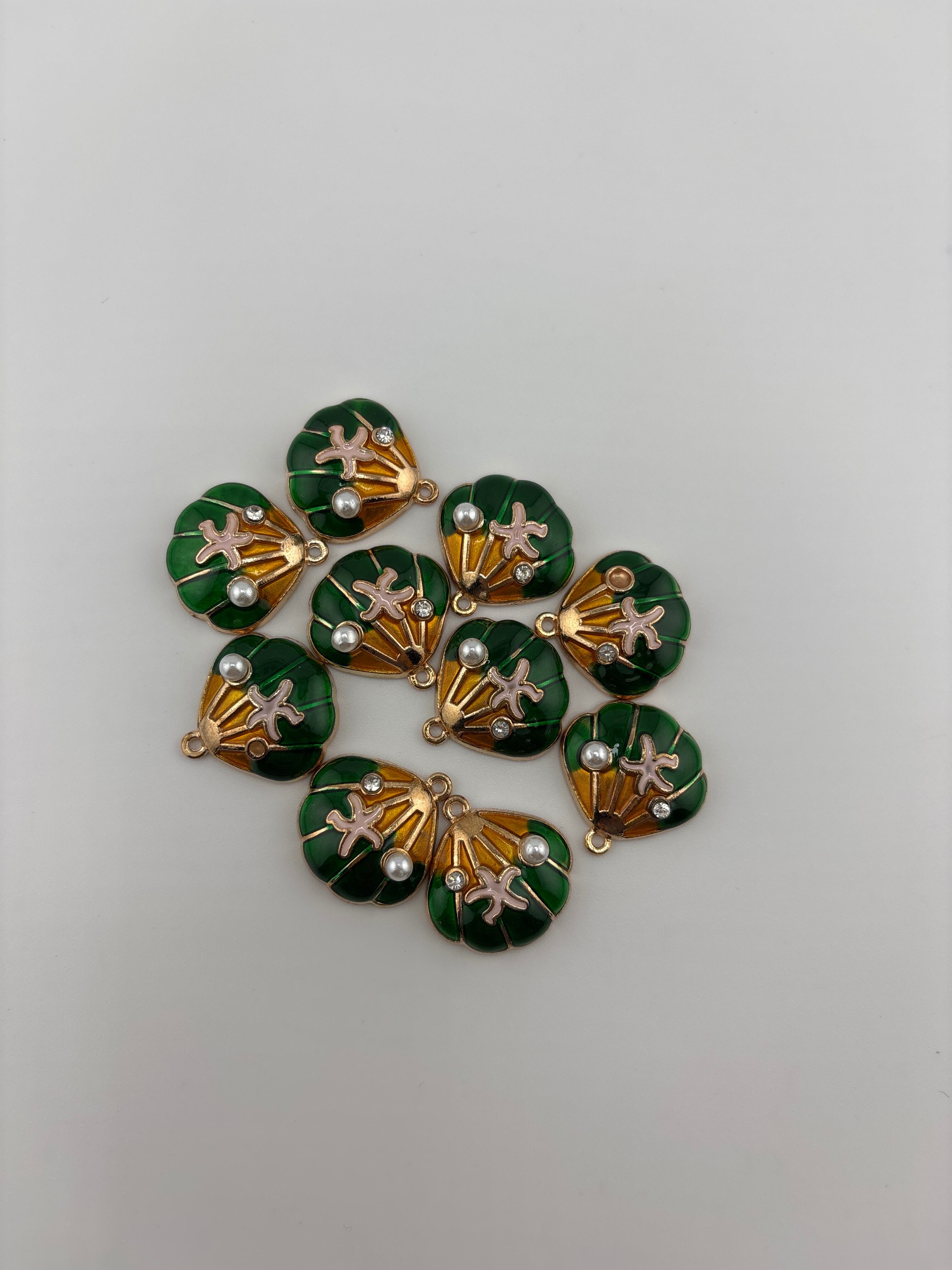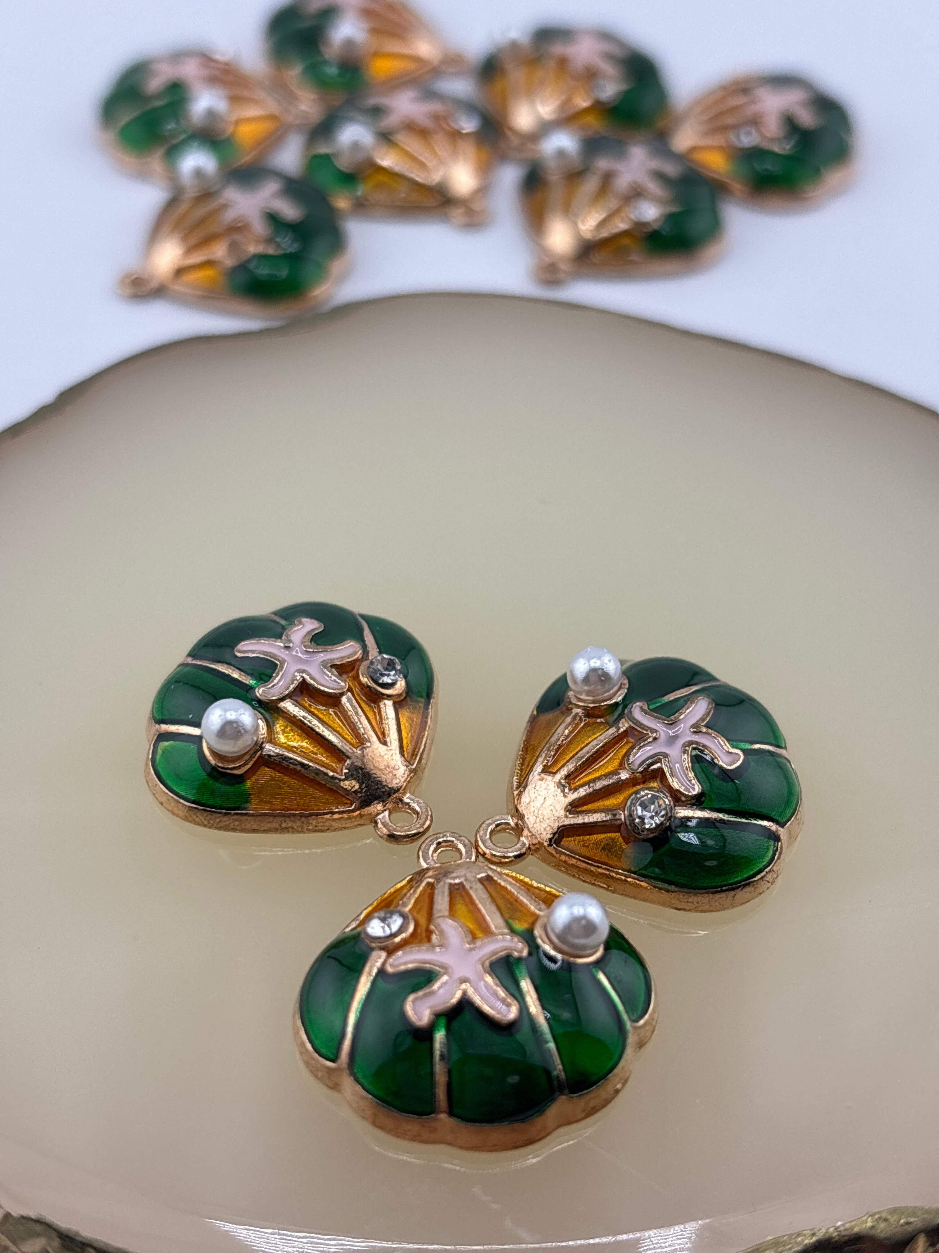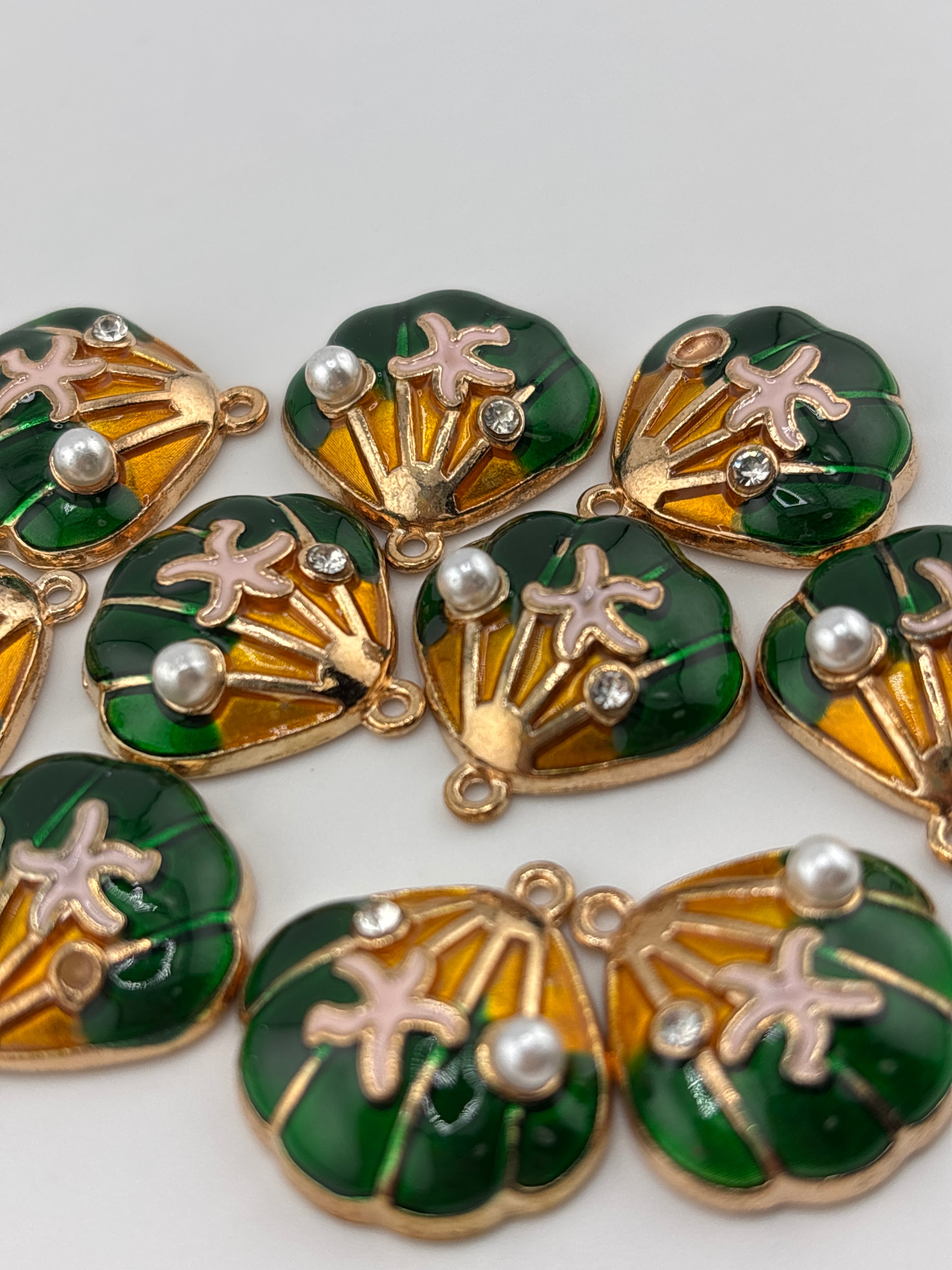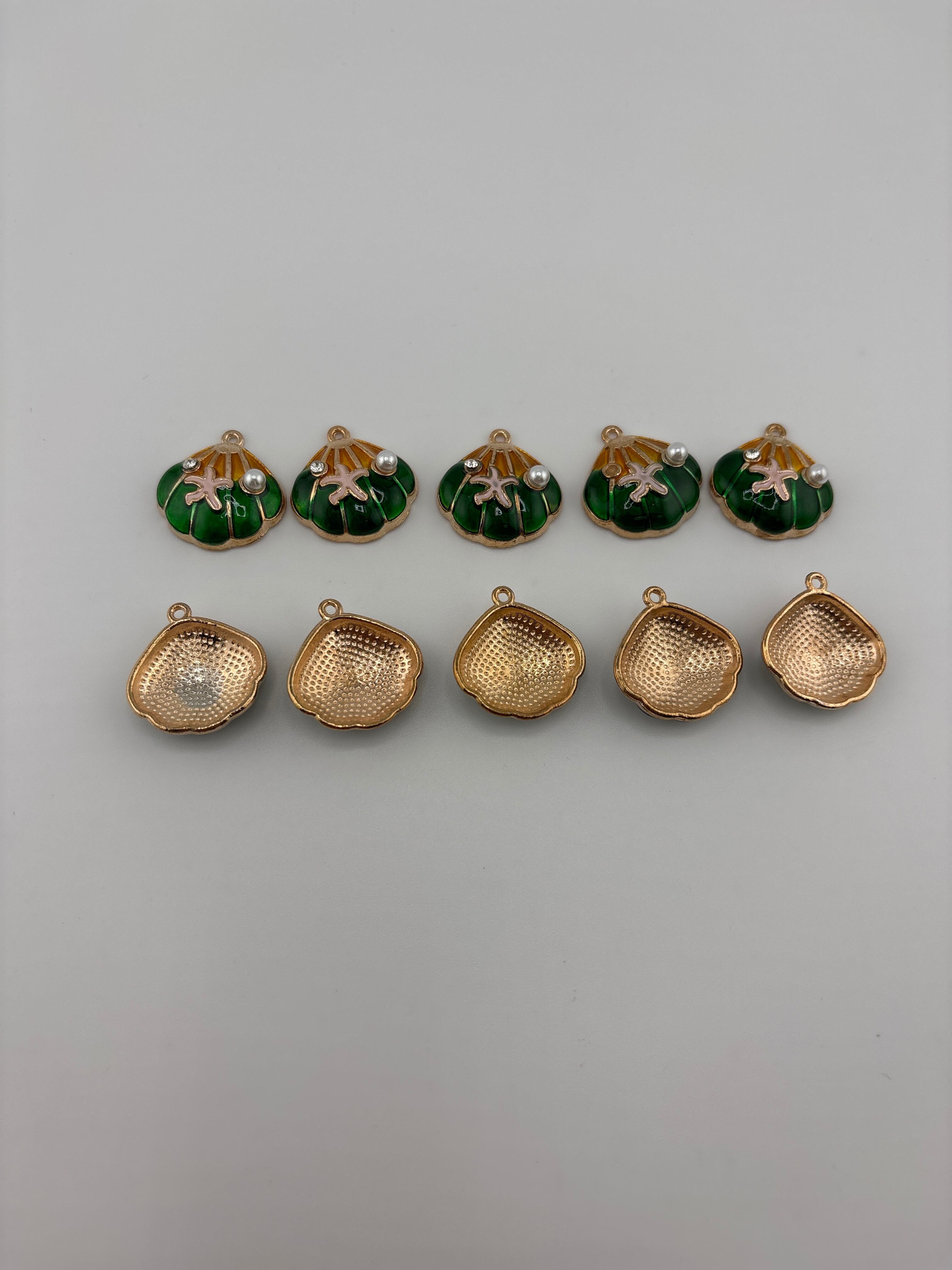 No.012 貝殻モチーフチャーム グリーン×ゴールド 21×21mm 10個入り
