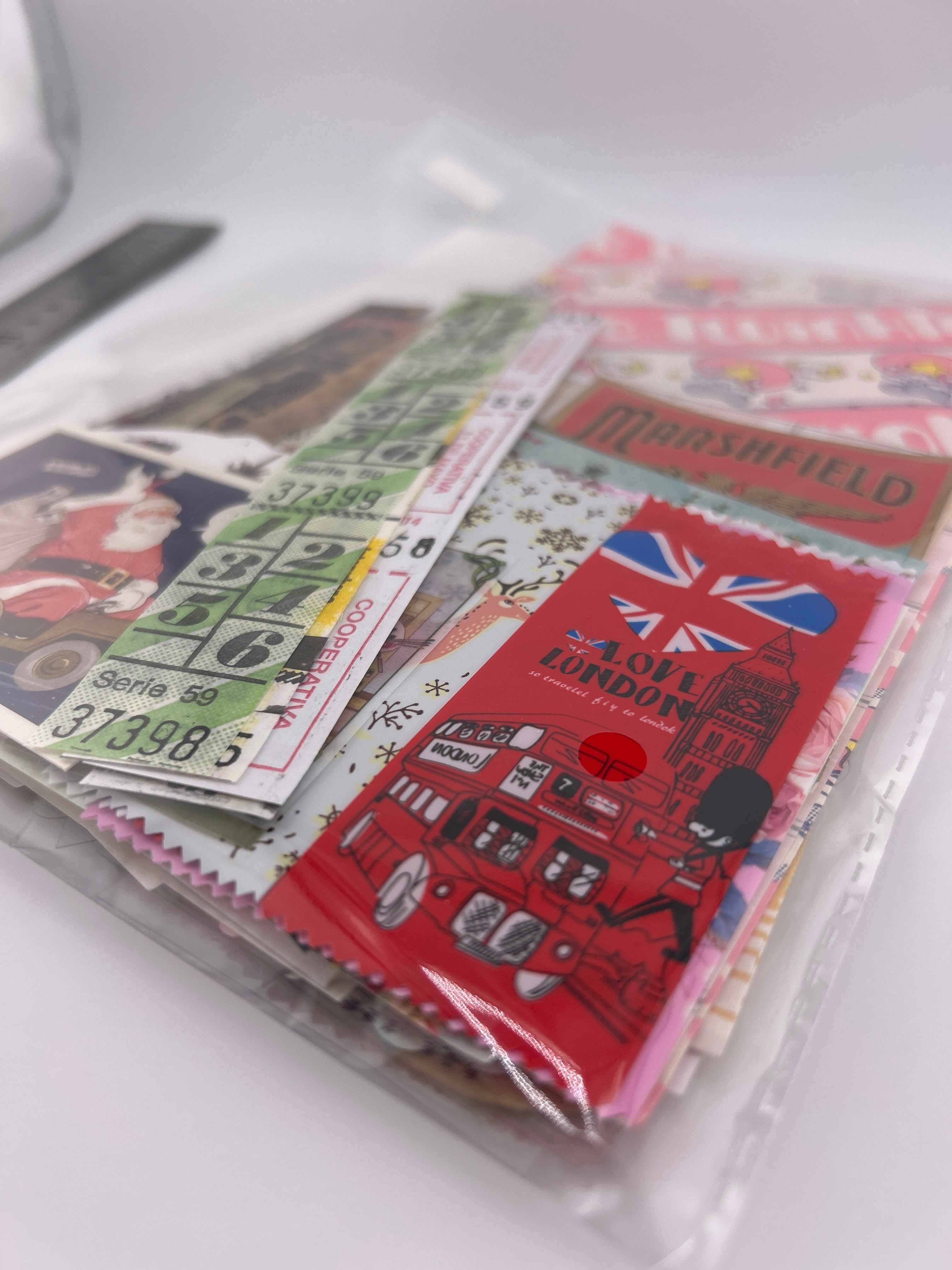 コラージュや手帳デコ、スクラップブッキングに使える紙モノのアソートセットです。