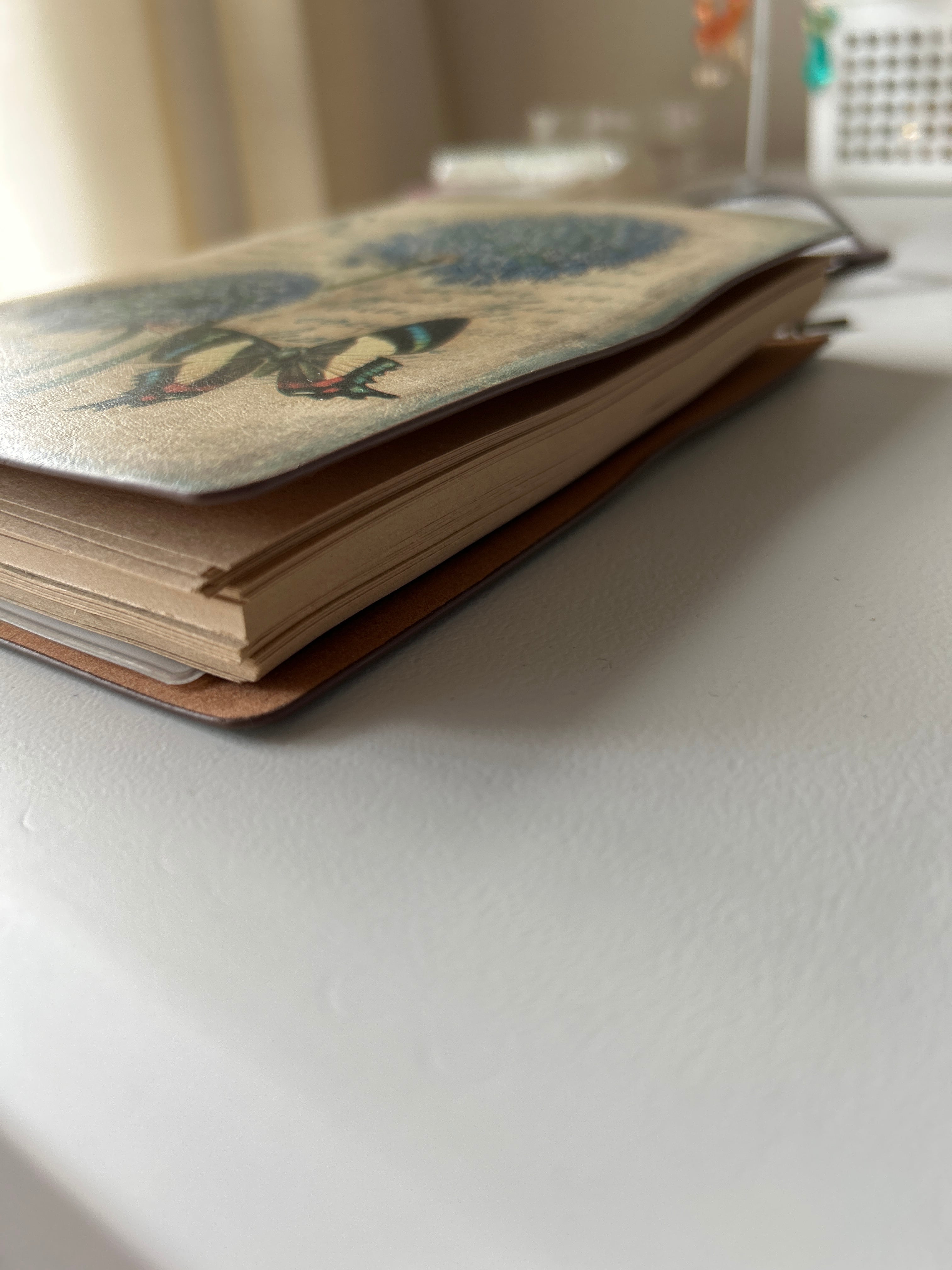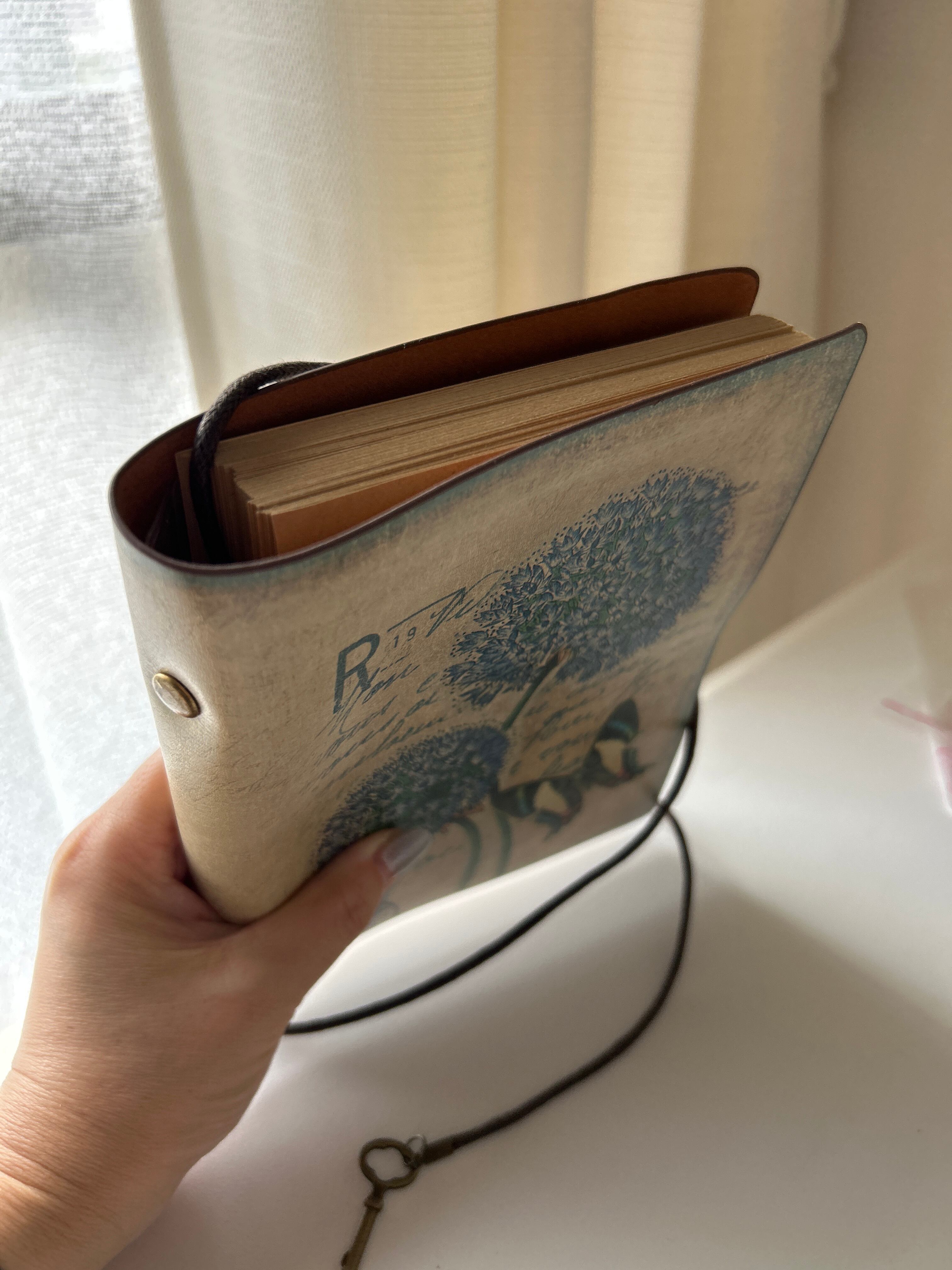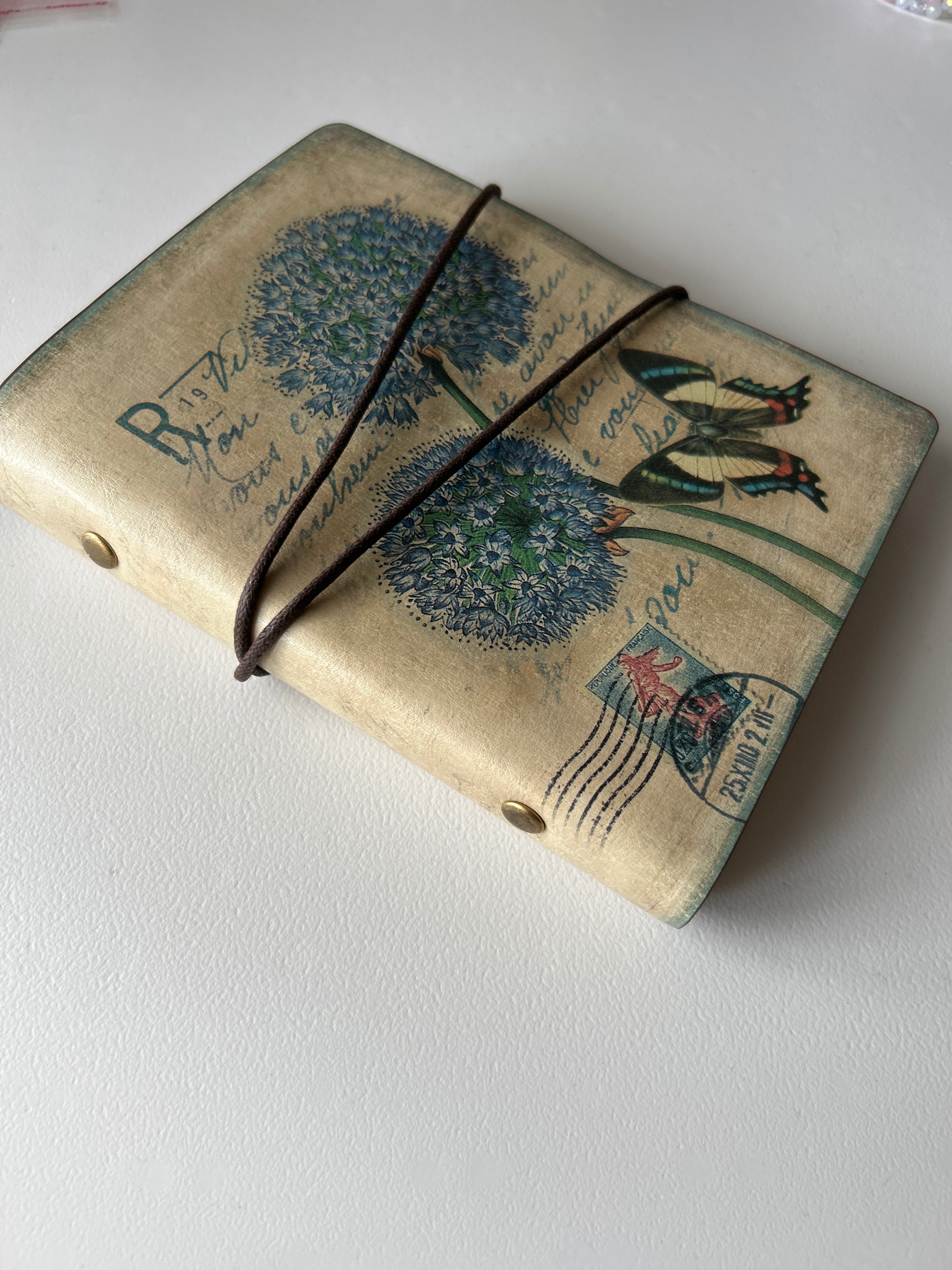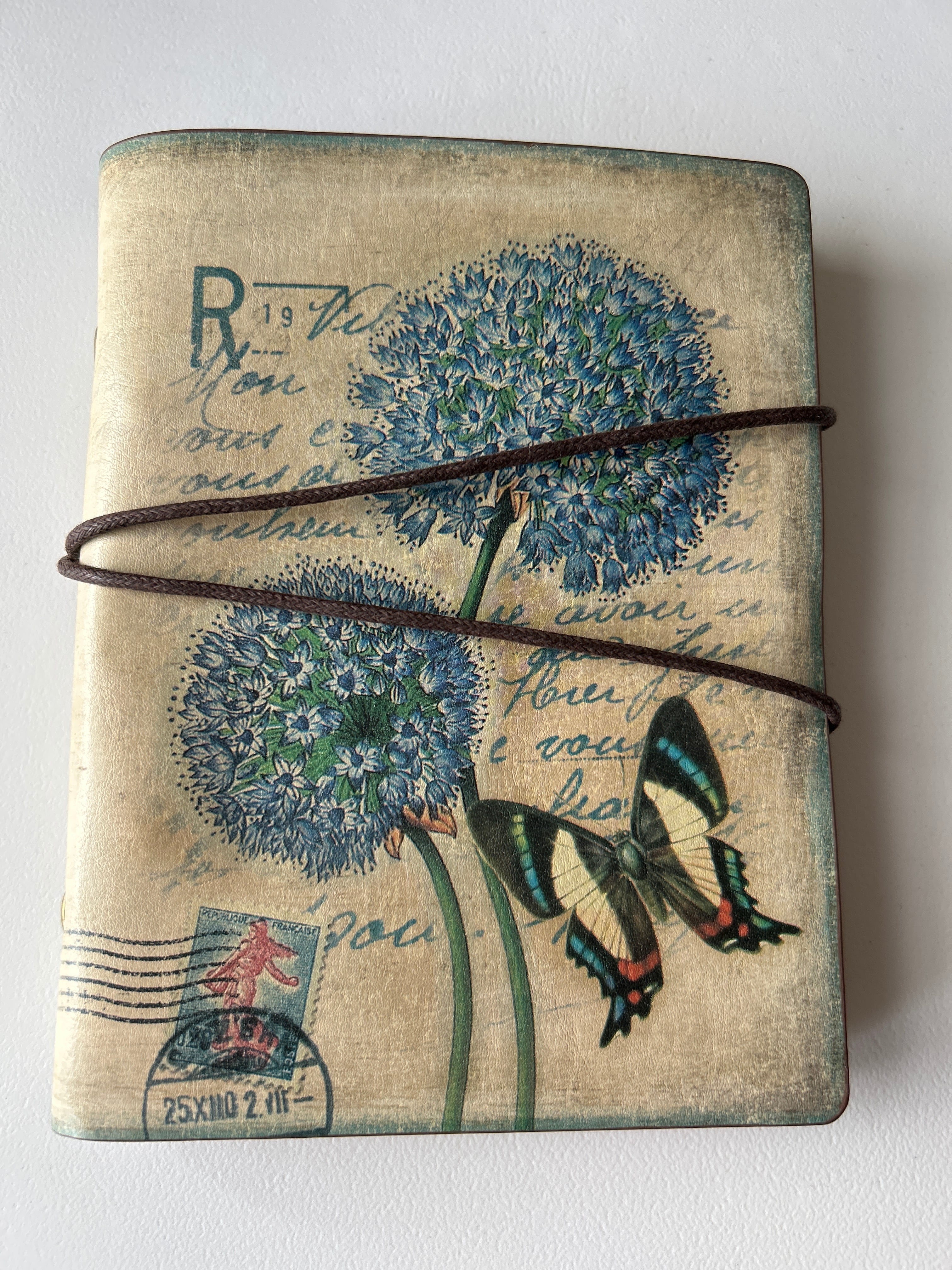 ブルーの花と蝶が描かれた、アンティーク調のデザイン手帳。