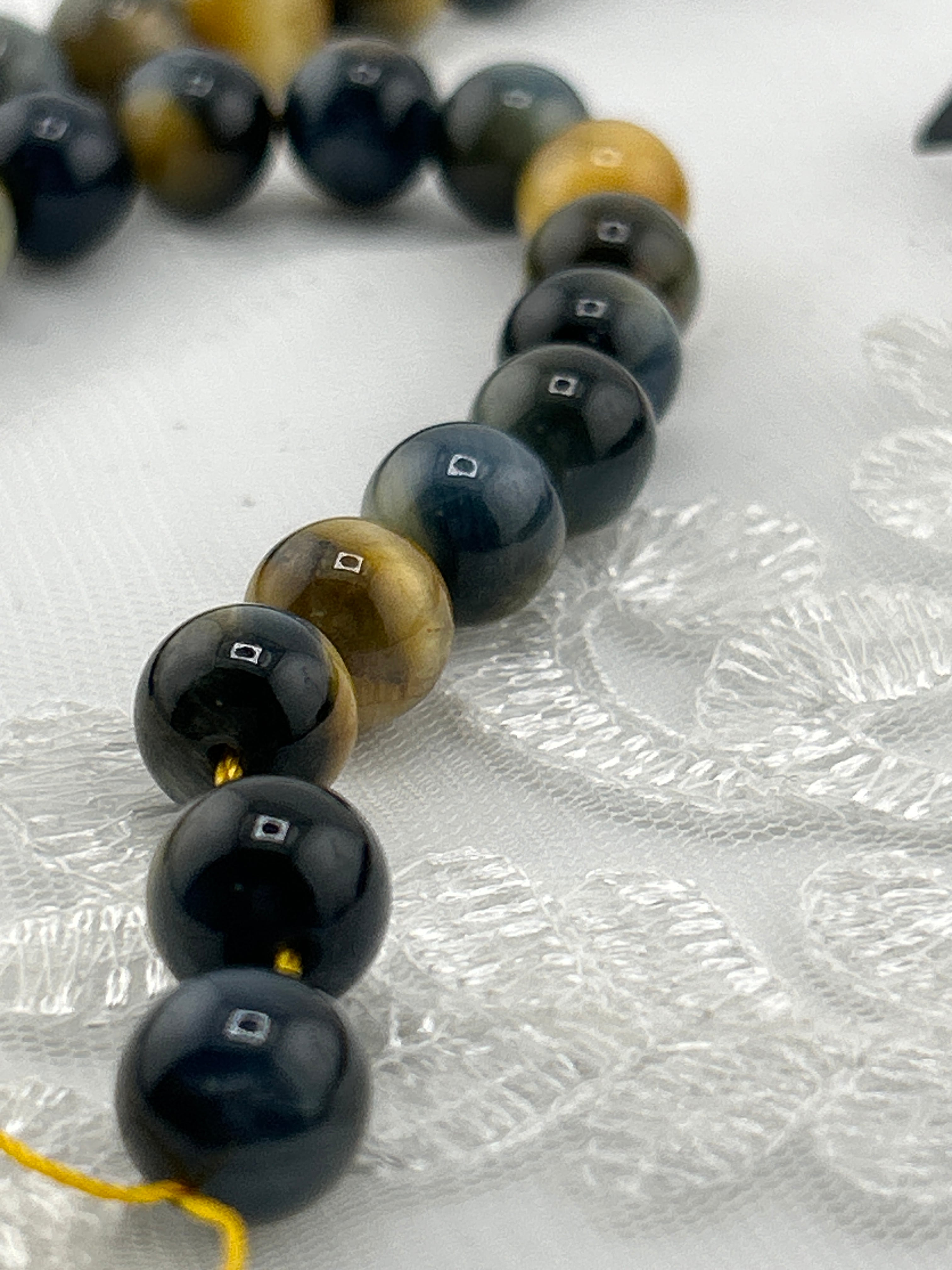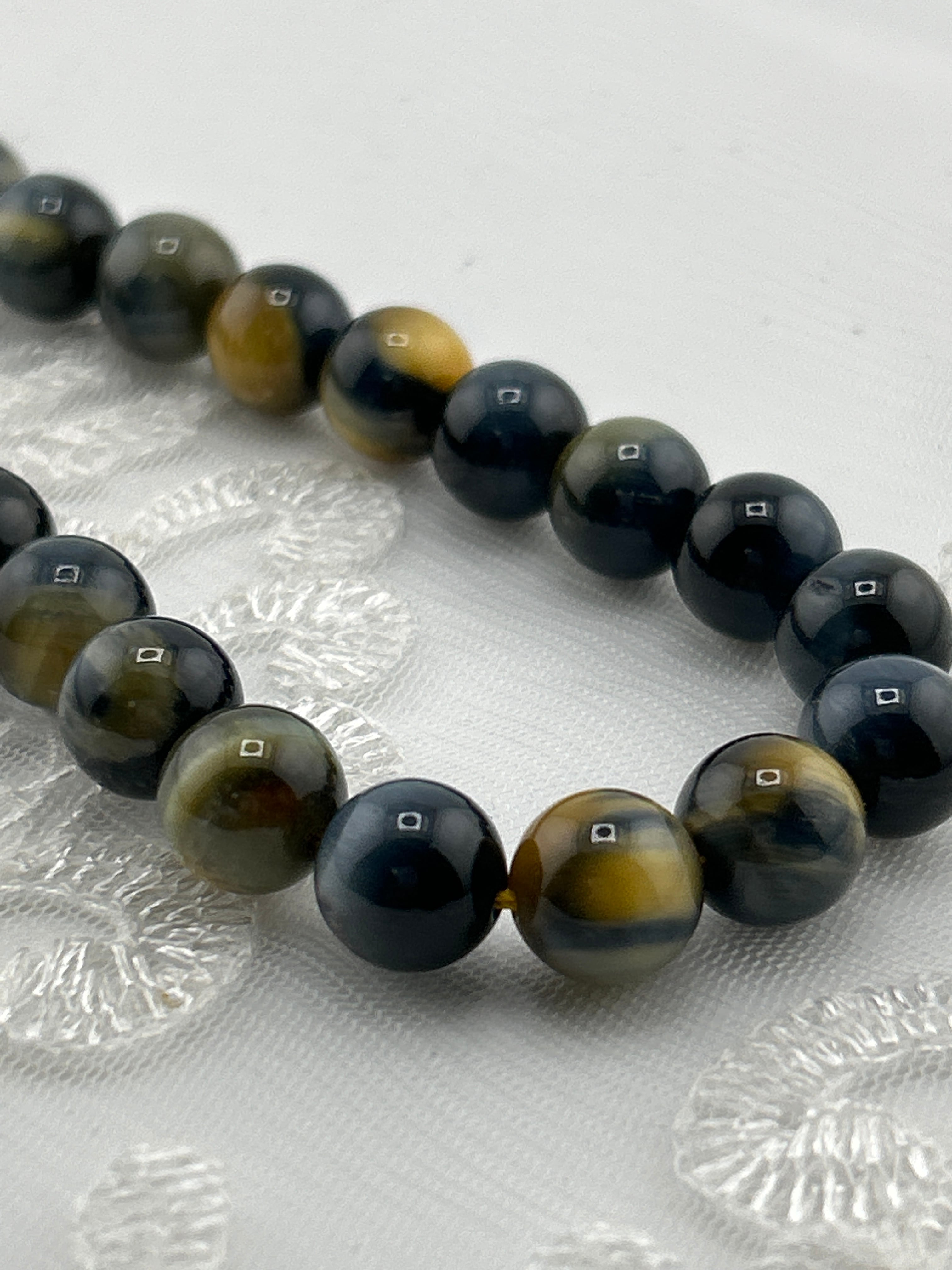深みのあるブルーグレーとゴールドブラウンが混ざり合う、ホークスアイ(ブルータイガーアイ)とタイガーアイの一連です。