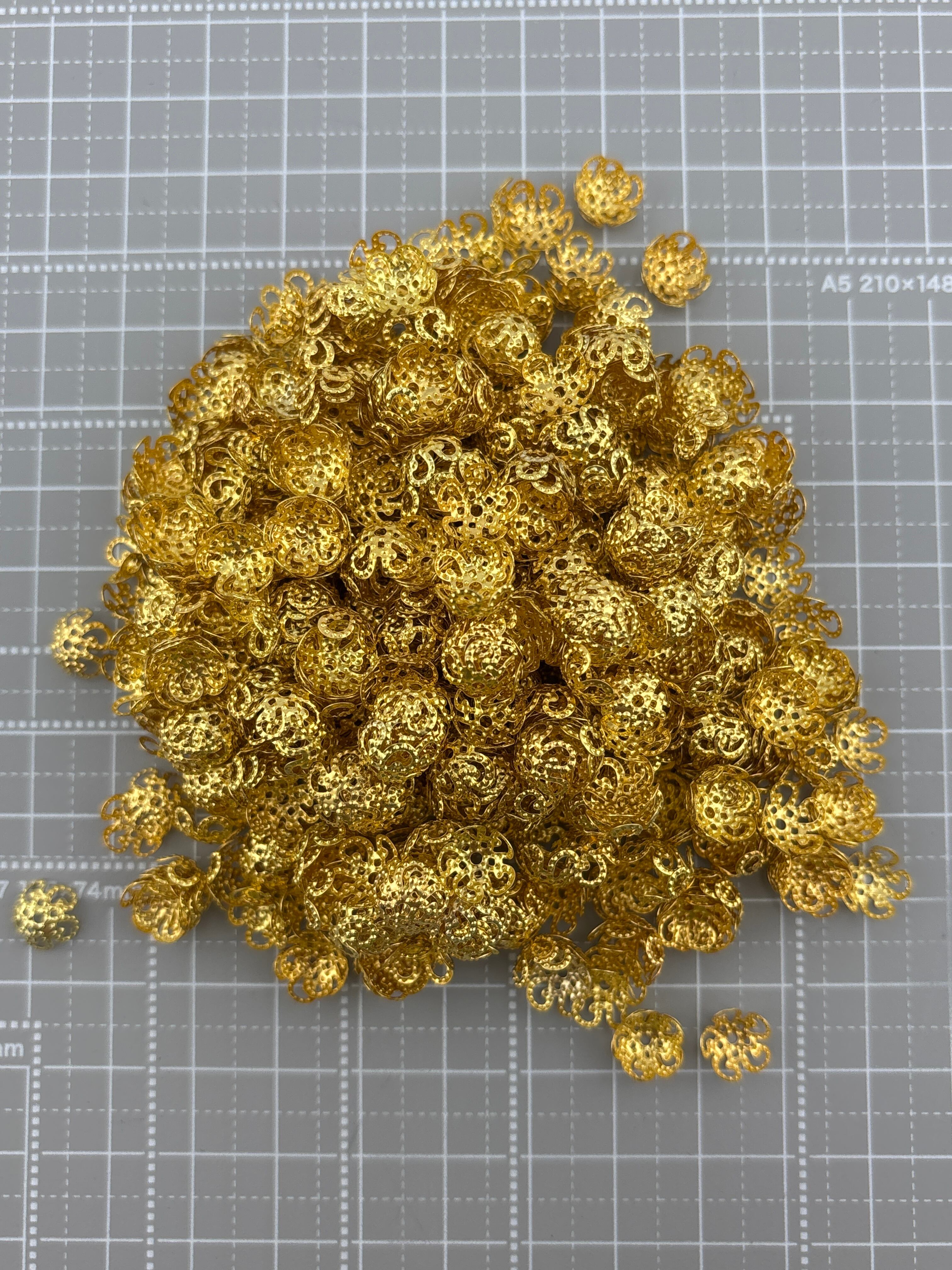 透かしデザインの花座・座金・ビーズキャップです。ビーズやパールに組み合わせることで、装飾性が高まり、立体感や高級感のある仕上がりになります。アクセサリー制作のアクセントとして使いやすく、ハンドメイド材料をお探しの方にもおすすめです。