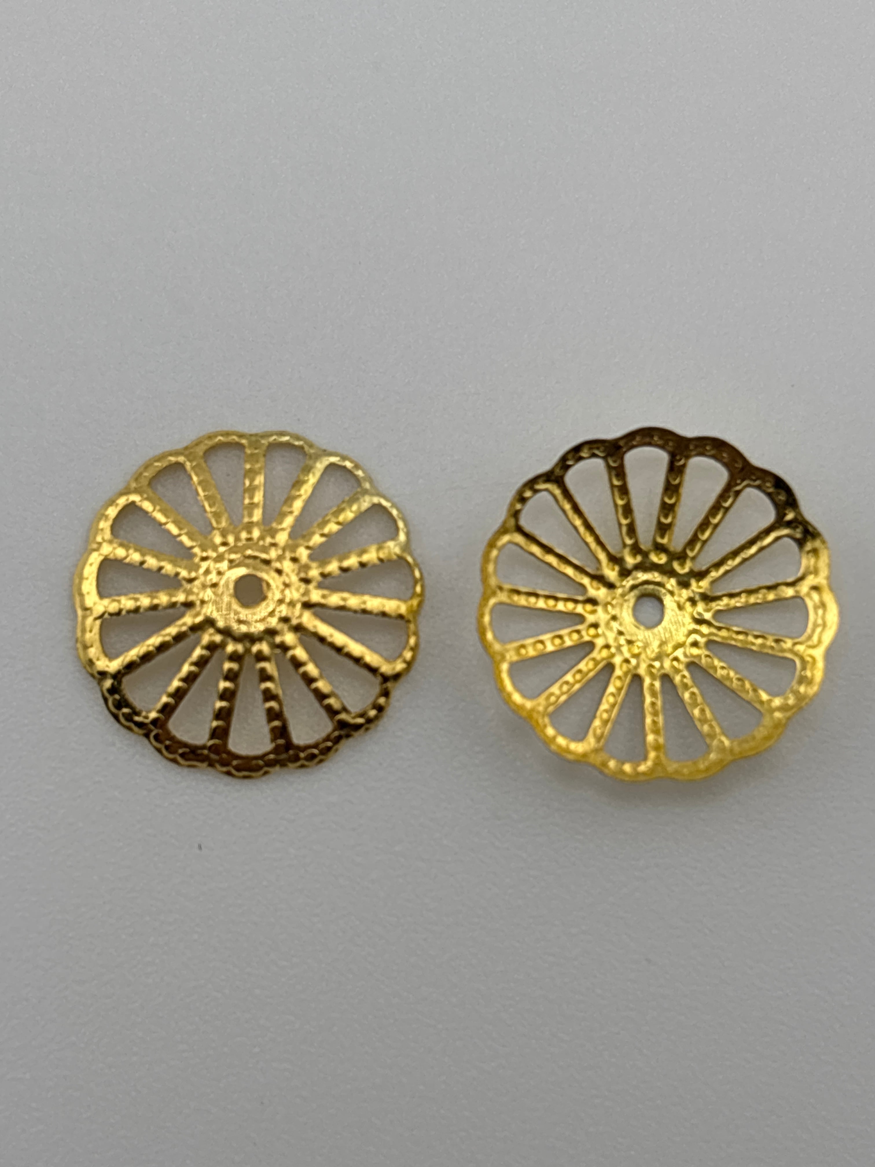 放射状の透かし模様が特徴の花座・ビーズキャップです。存在感のあるサイズで、ビーズやパールに合わせることで作品に華やかさと立体感をプラスできます。アクセサリー制作のアクセントにも使いやすく、ハンドメイド材料として取り入れやすいリユース資材です。