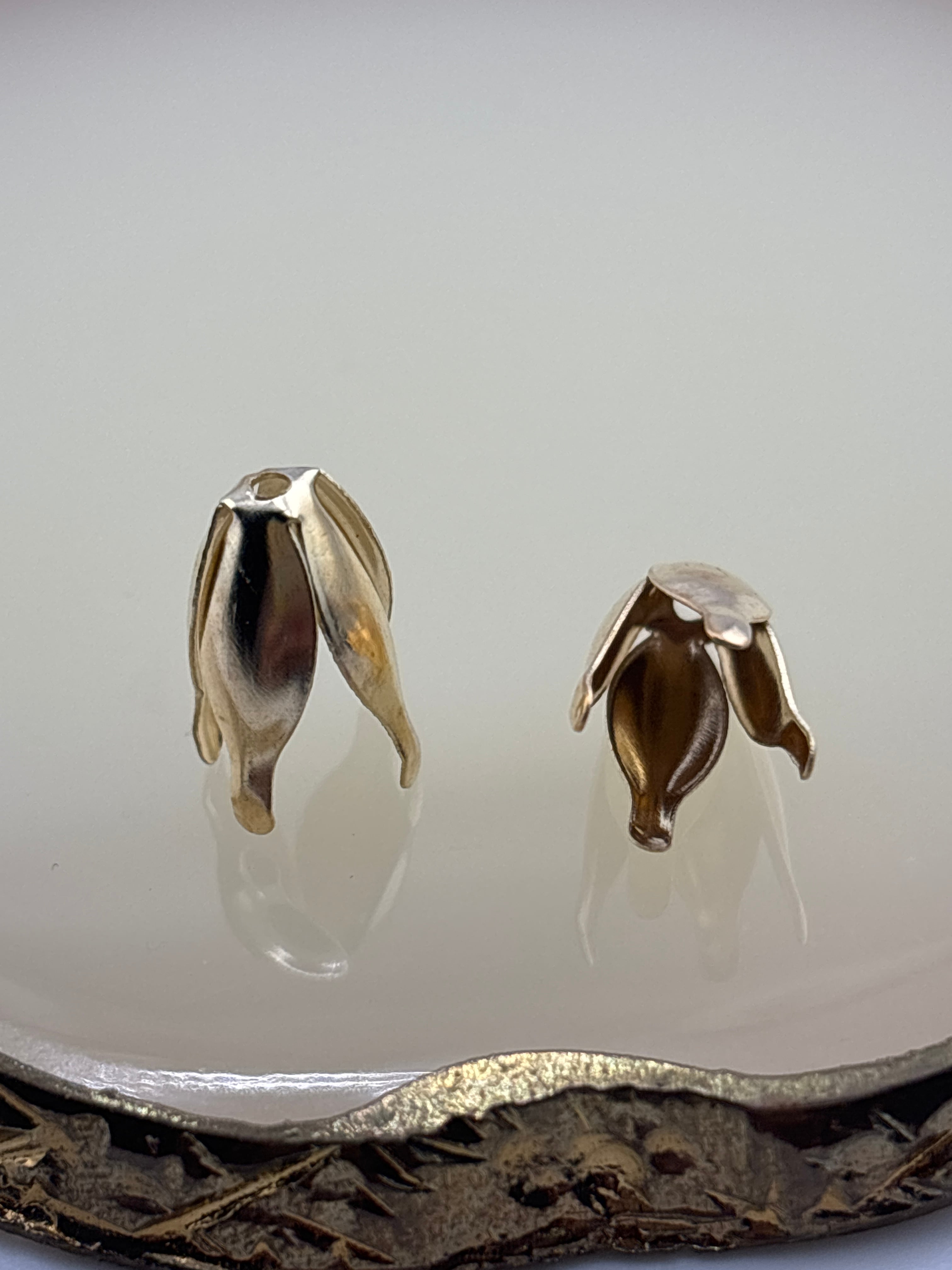 細長いリーフ形状の花座・ビーズキャップです。ビーズやパールにかぶせるように合わせることで、縦ラインが強調され、作品に上品で立体的なアクセントを加えることができます。存在感のあるシルエットで、ハンドメイドアクセサリー制作のポイント使いにも最適なリユース資材です。