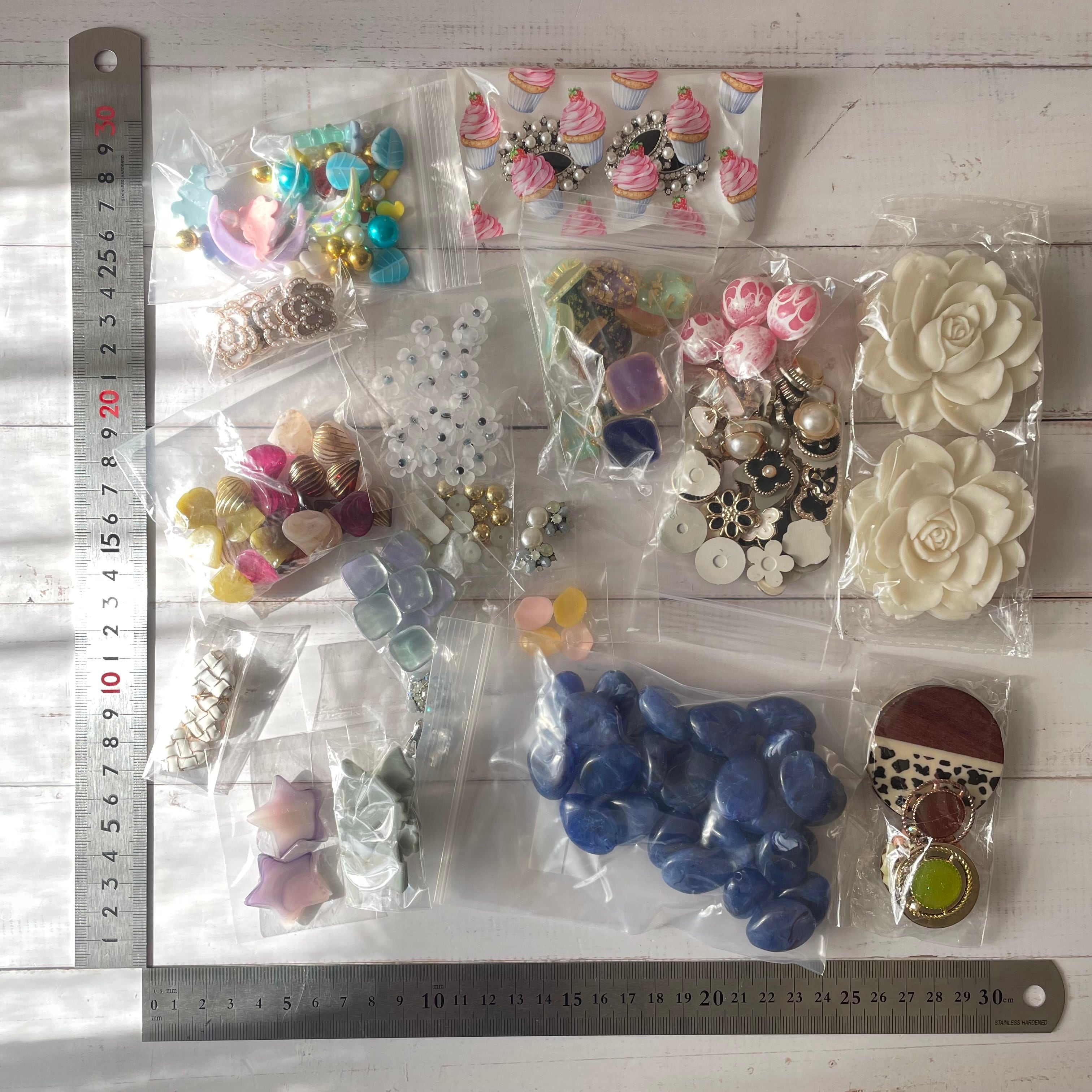フラワーモチーフ、シェル風パーツ、マーブル、星型、アクリルカボション、貼り付け用金具類など、デコ・レジン・アクセサリー制作にすぐ使えるパーツがたっぷり入っています。