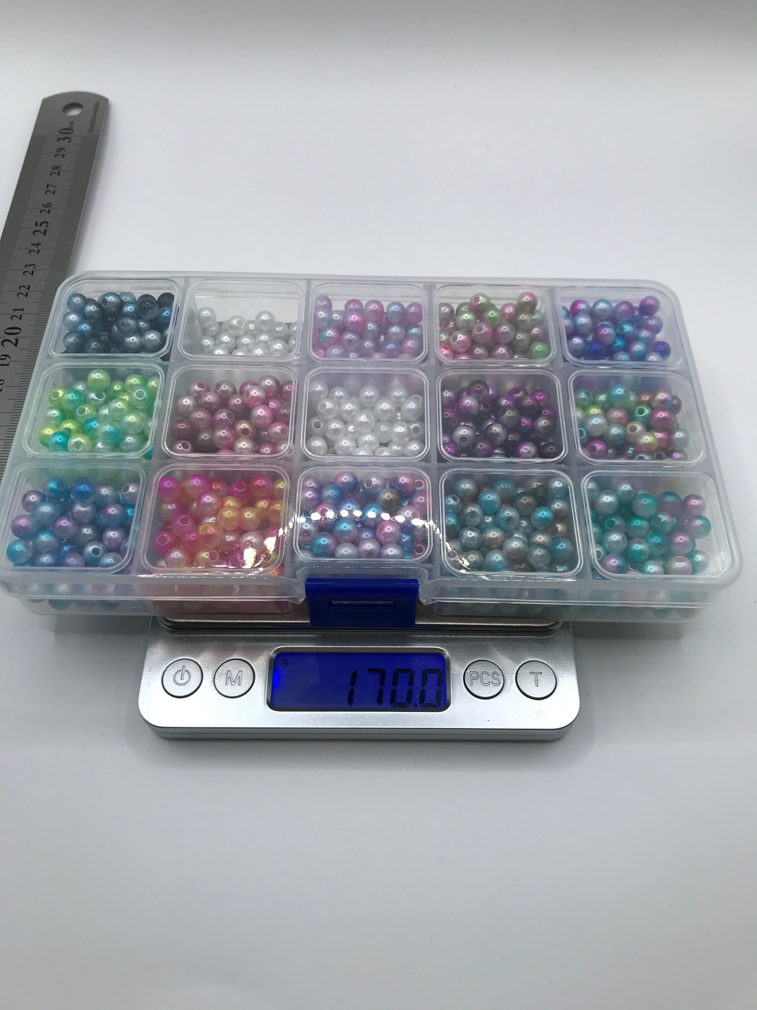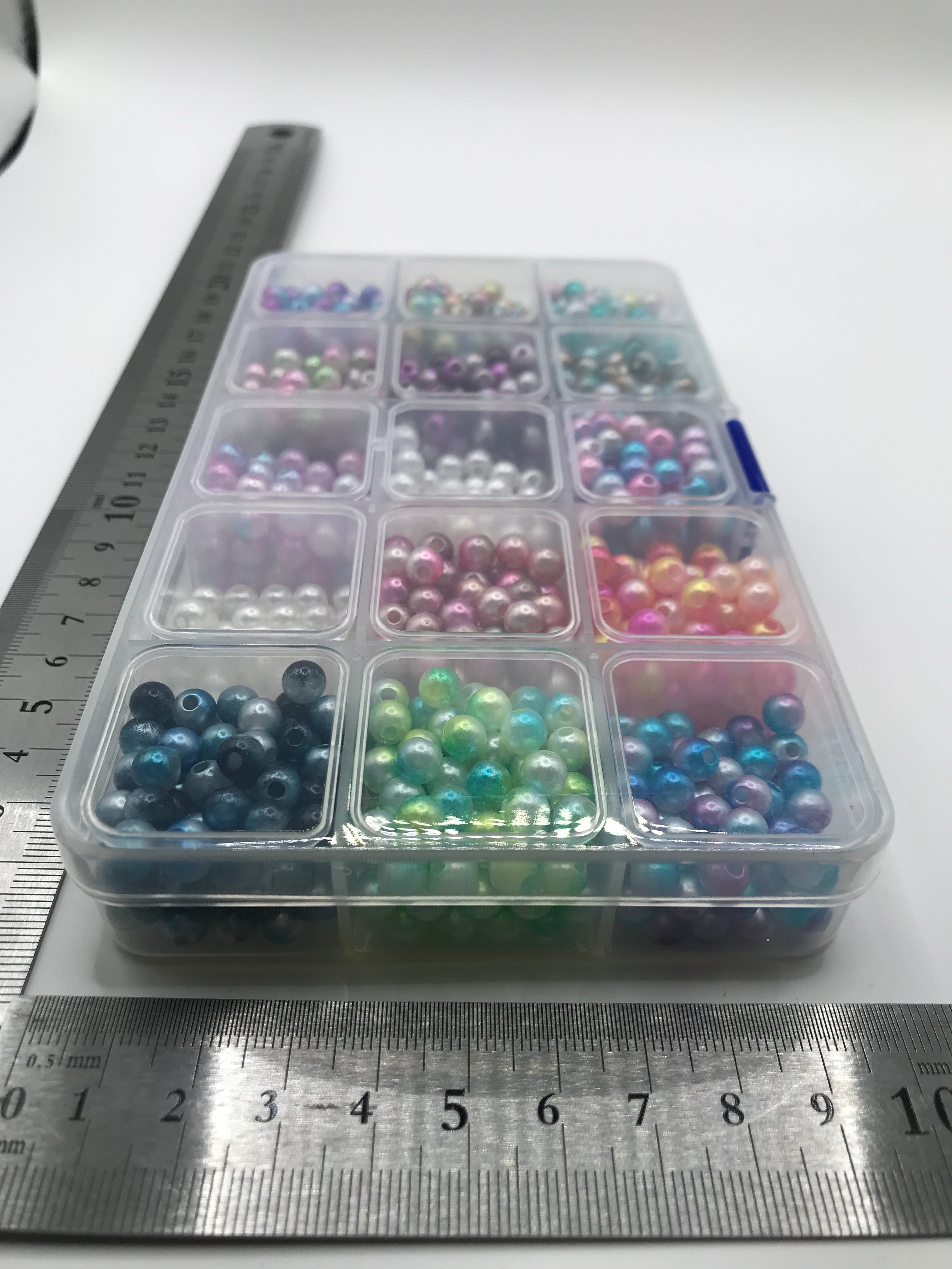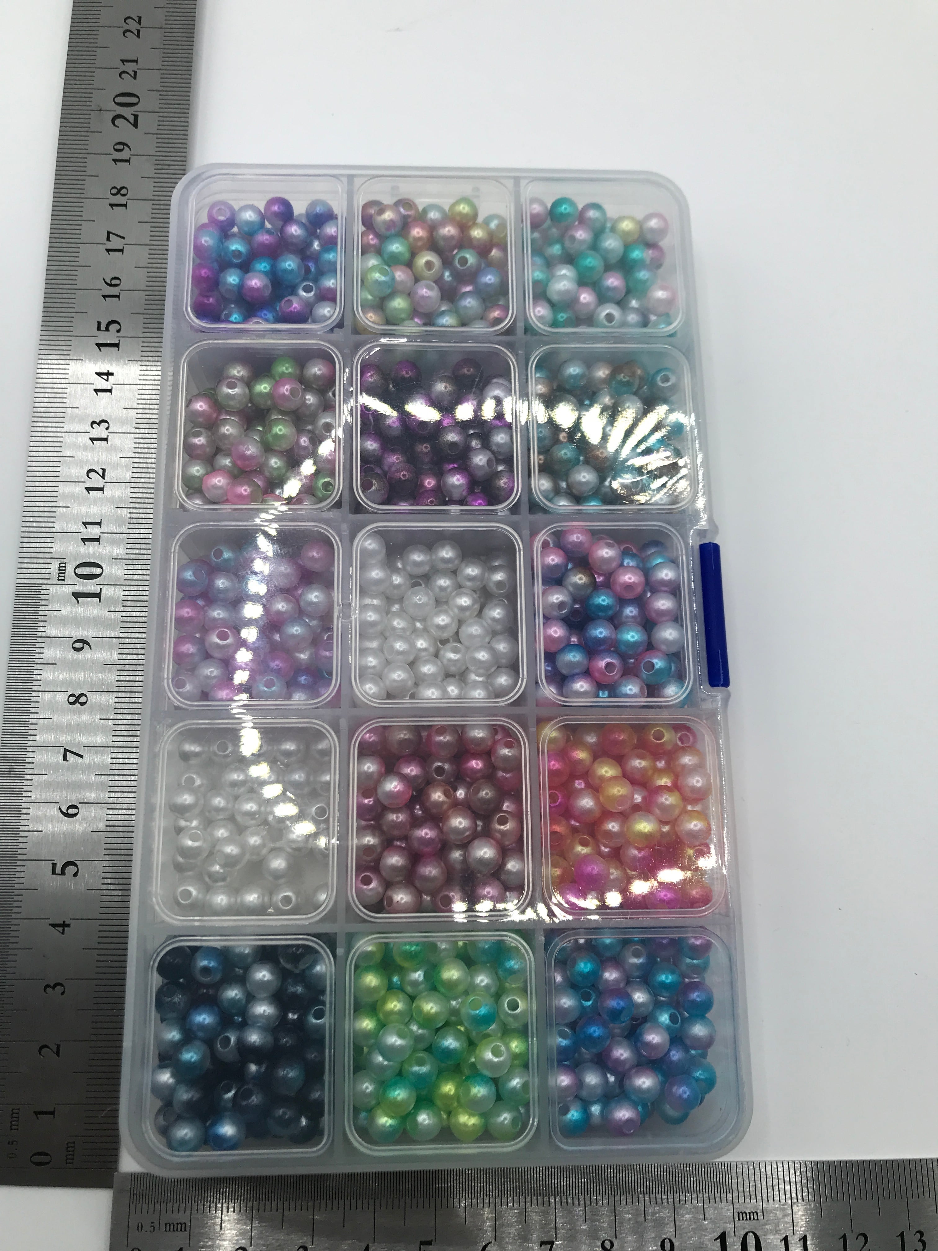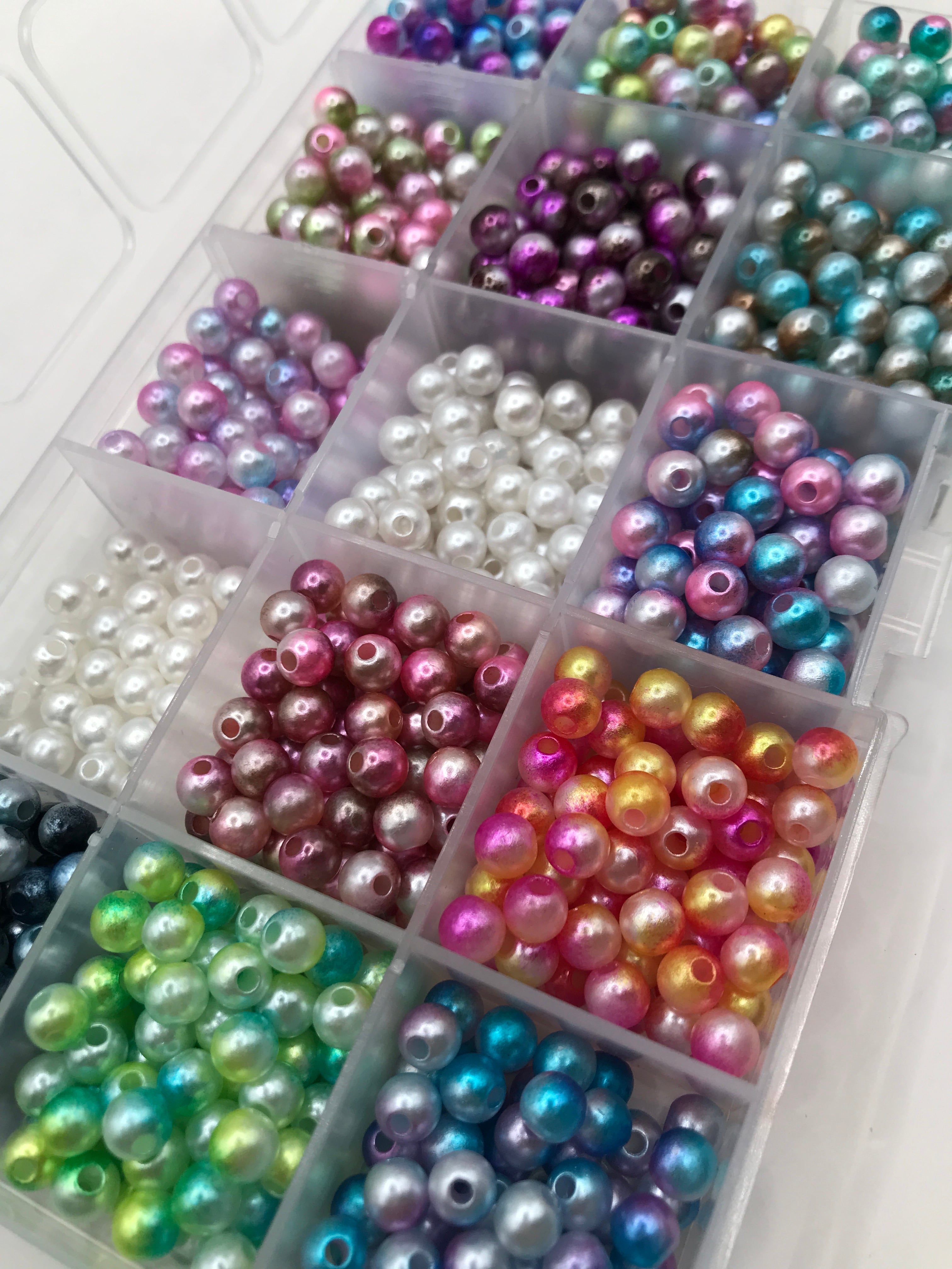 カラフルなパール調ビーズを12マスに仕分けした状態で、