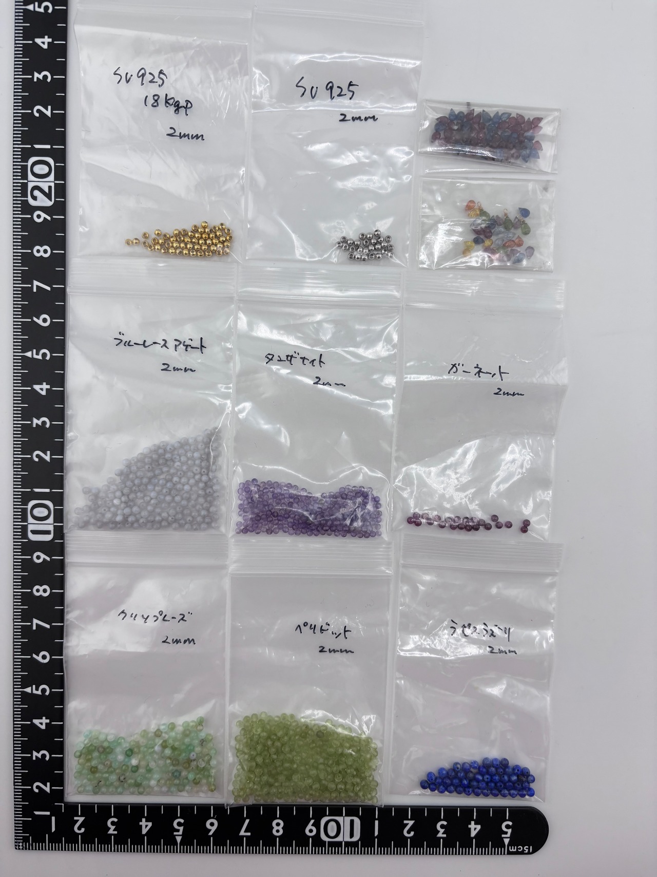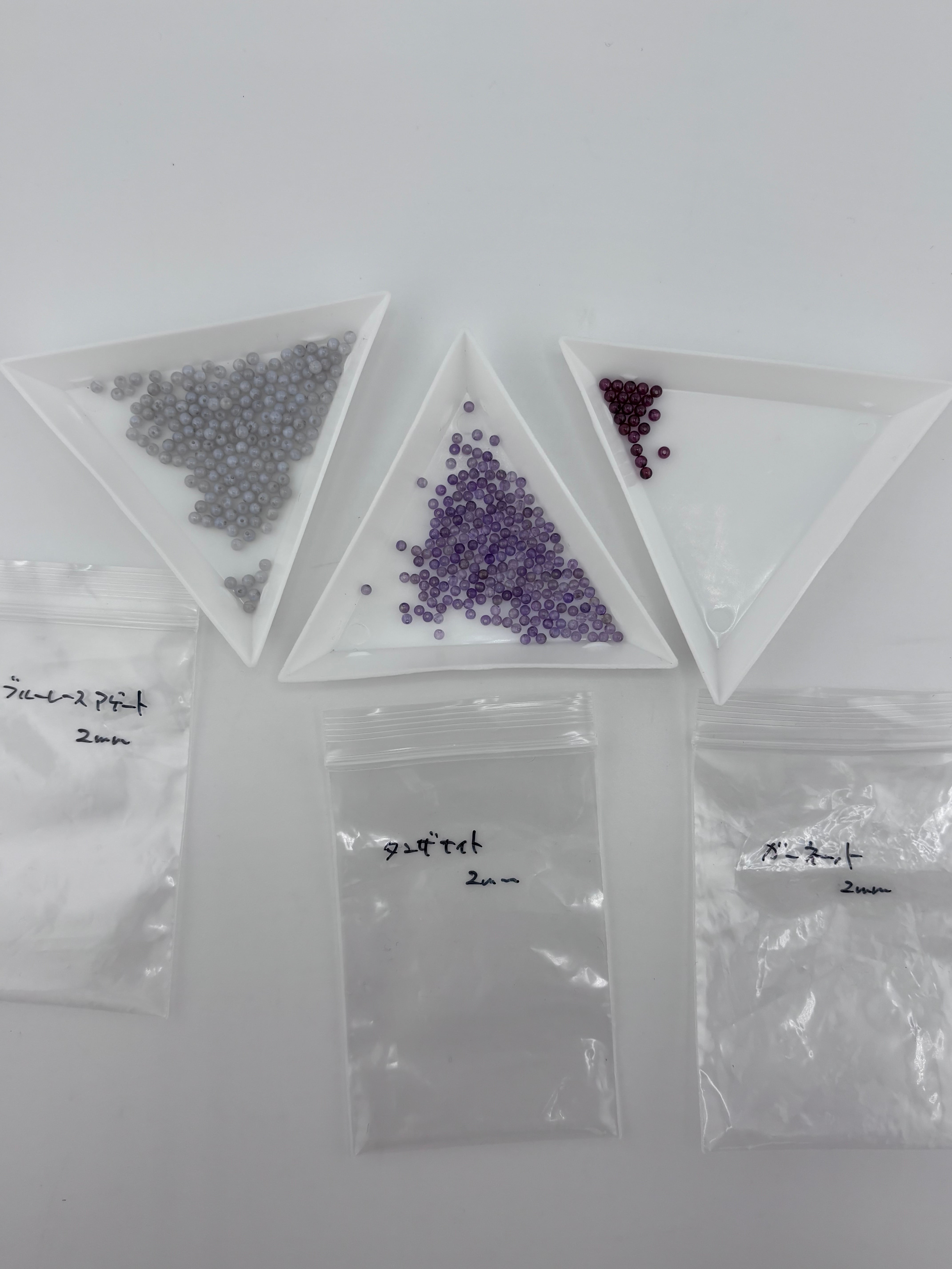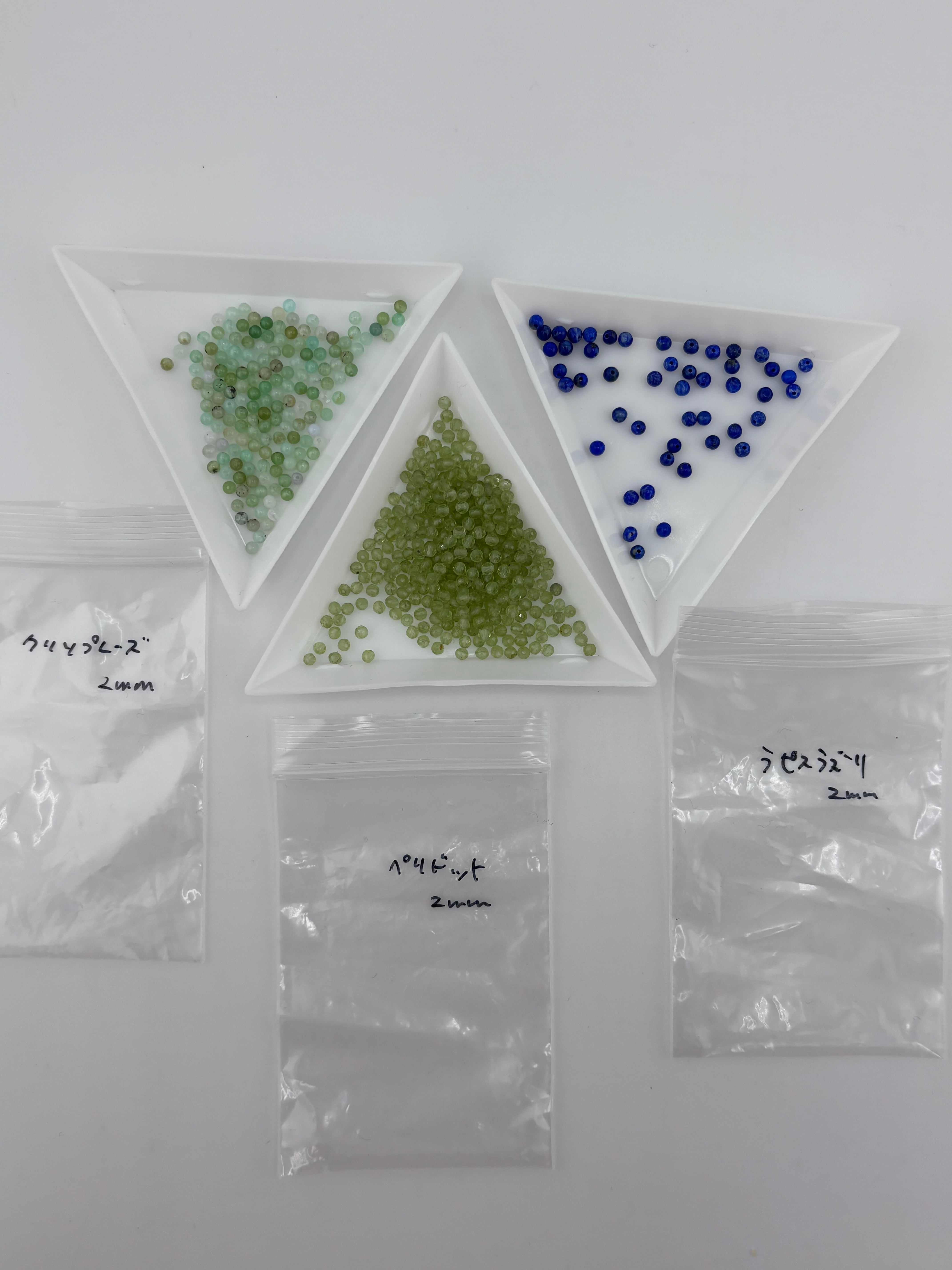 55 クリソプレーズ、ペリドット、ラピスラズリ、ブルーレースアゲート、タンザナイト、ガーネットなど 2mm【リユース】1連 24.7g