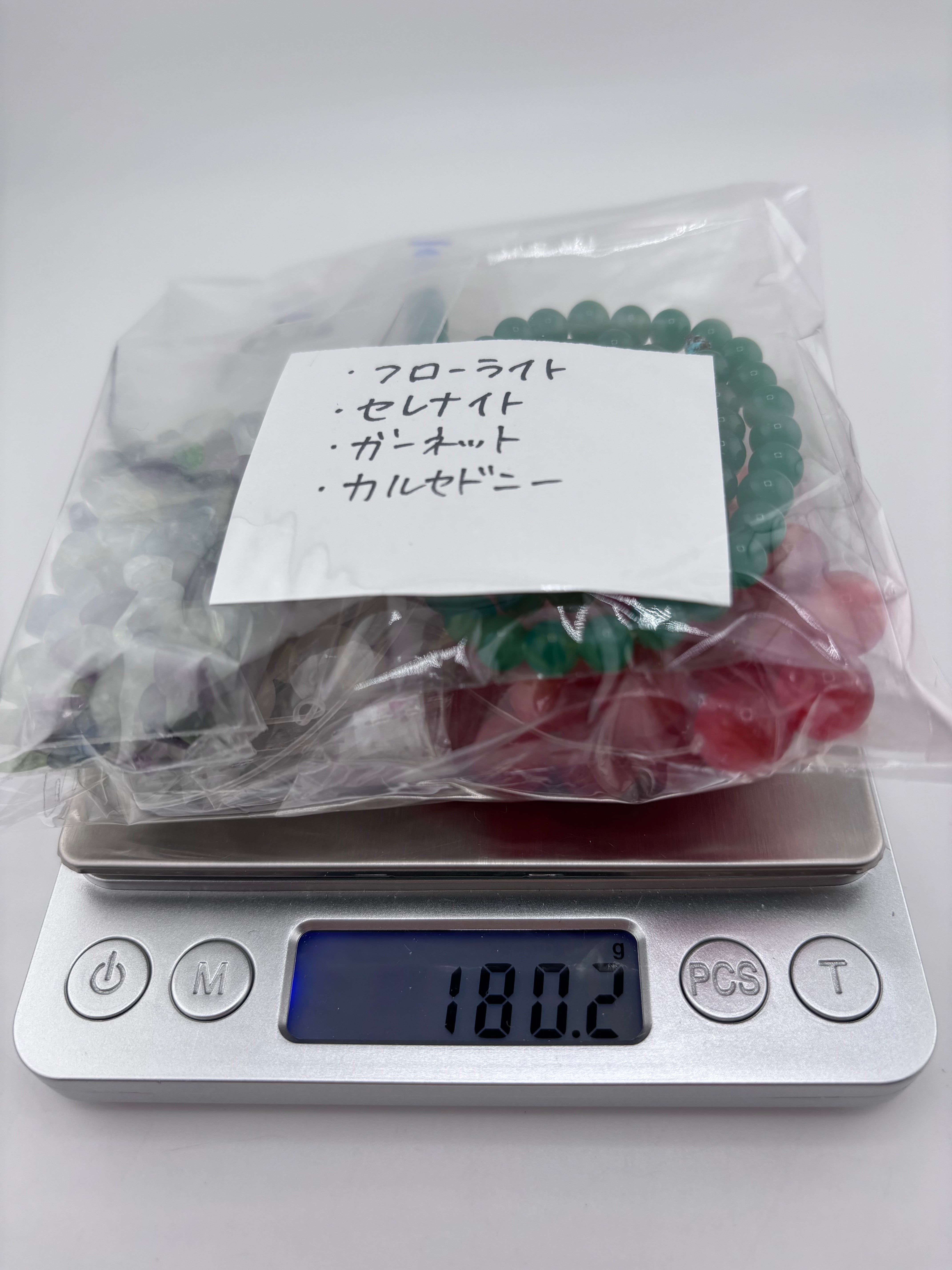 70 フローライト、セレナイト、ガーネット、カルセドニー 4.2mm〜10.2mm 【リユース】 1連 180.2g